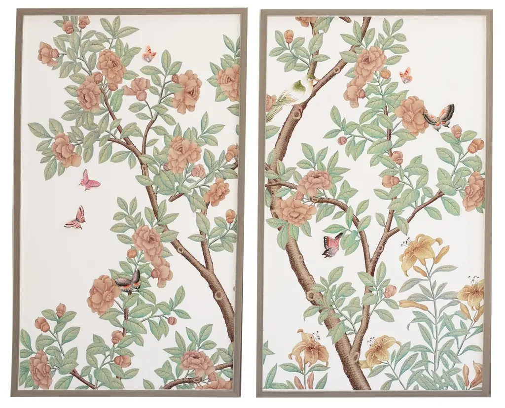 Hand-cut butterflies placed atop prints of delicately rendered trees add eye-catching depth to this chinoiserie-inspired triptych. The pictures arrive framed and ready to hang.
