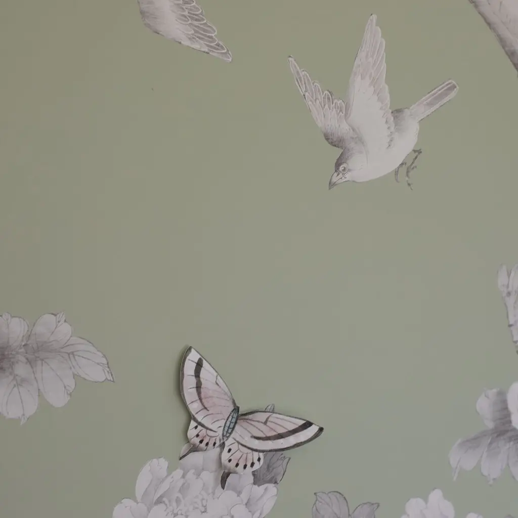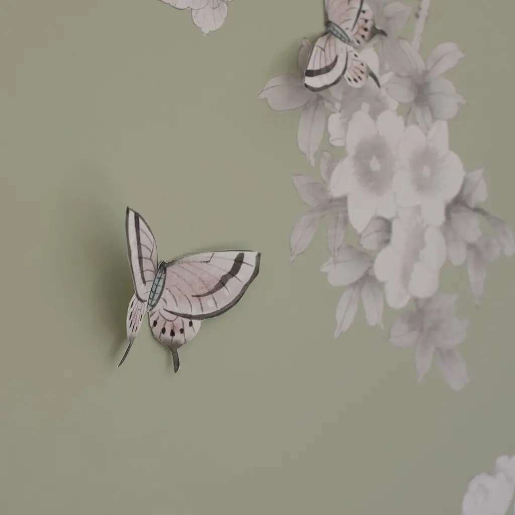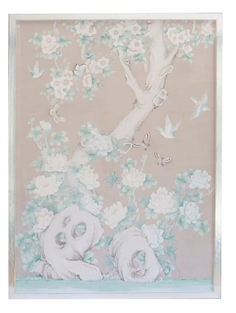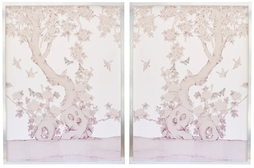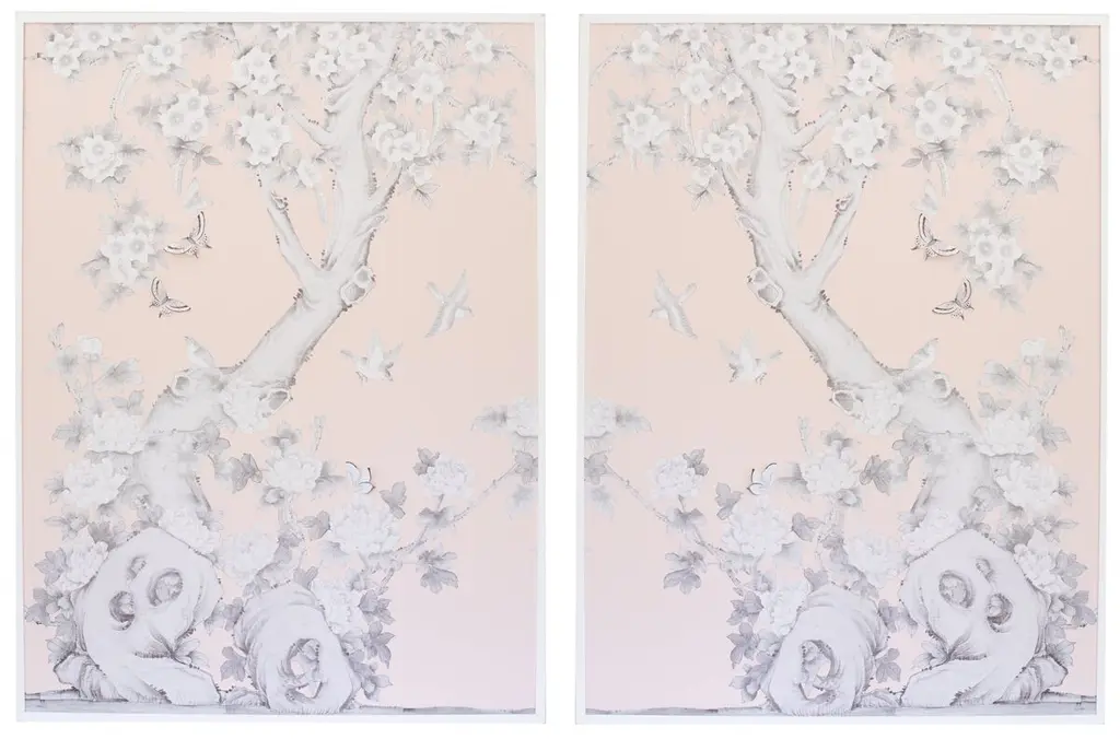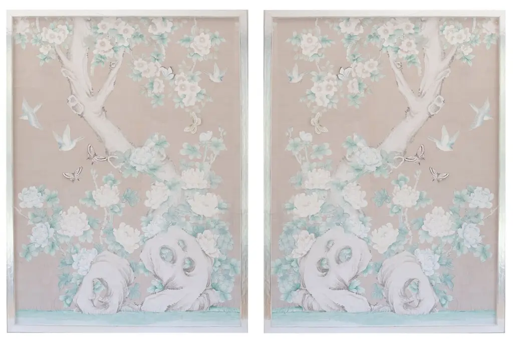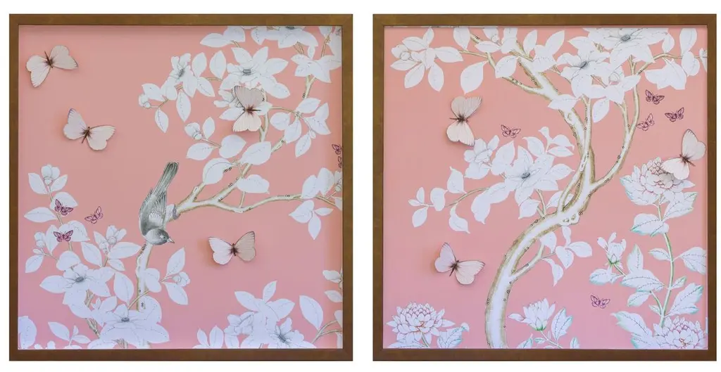 Hand-cut butterflies placed atop prints of delicately rendered trees add eye-catching depth to this chinoiserie-inspired diptych. Arrives framed and ready to hang.