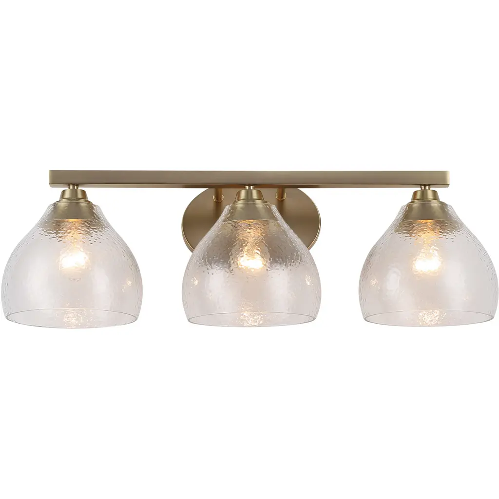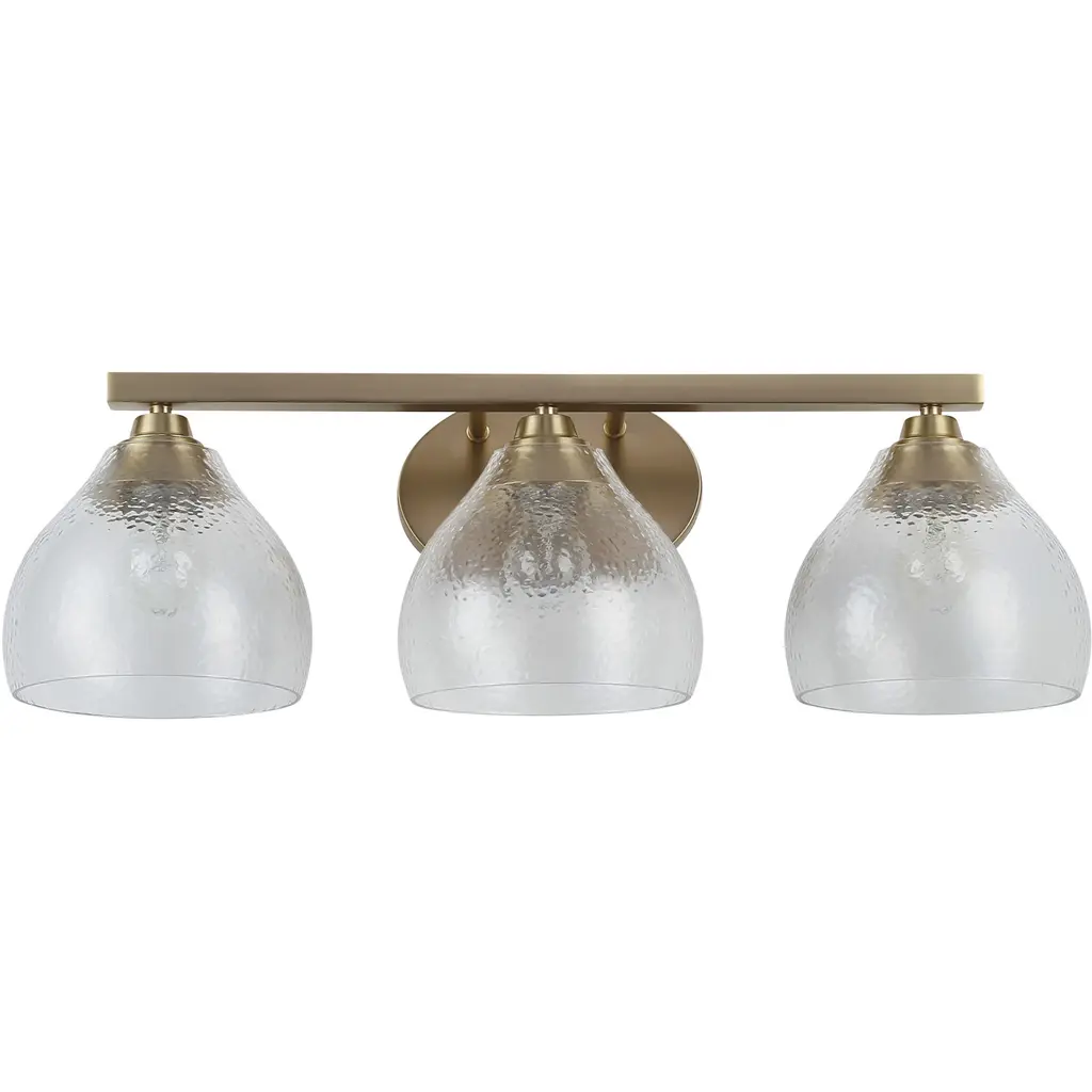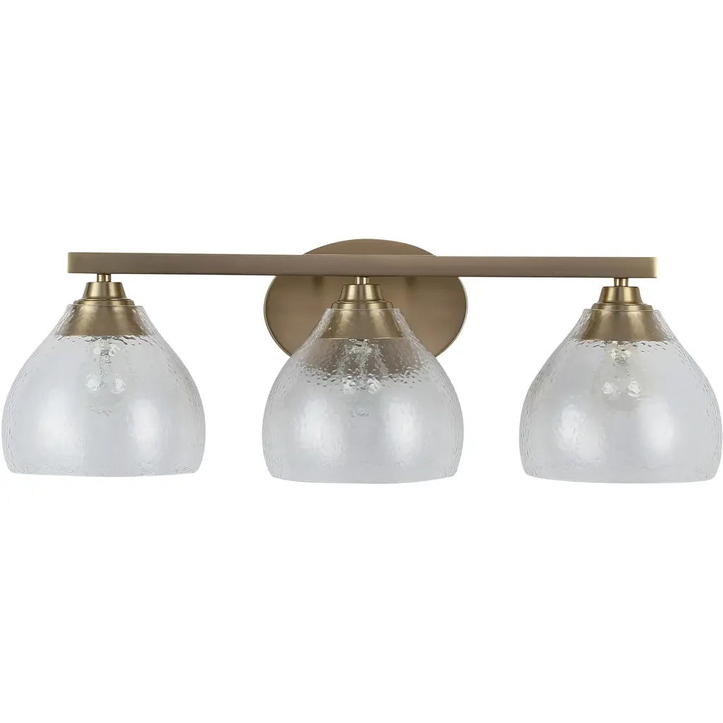 Bring Transitional elegance into your home with the Golden Lighting Ariella 3-light Vanity in Brushed Champagne Brass. Featuring a glass shade, it creates a welcoming atmosphere. The Hammered Clear Glass shade showcases a captivating texture that reflects light brilliantly. The sophisticated Brushed Champagne Brass finish provides a chic alternative to gold, ensuring a soft and warm ambiance. Rated for damp locations, the fixture is perfect for bathrooms or other moisture-prone areas. It requires 3 E26 Medium base bulbs (not included, max 60 watts per bulb), and its overall dimensions are 26.38"W x 8.88"H x 8.88"D. Discover a blend of elegance and quality with Golden Lighting.