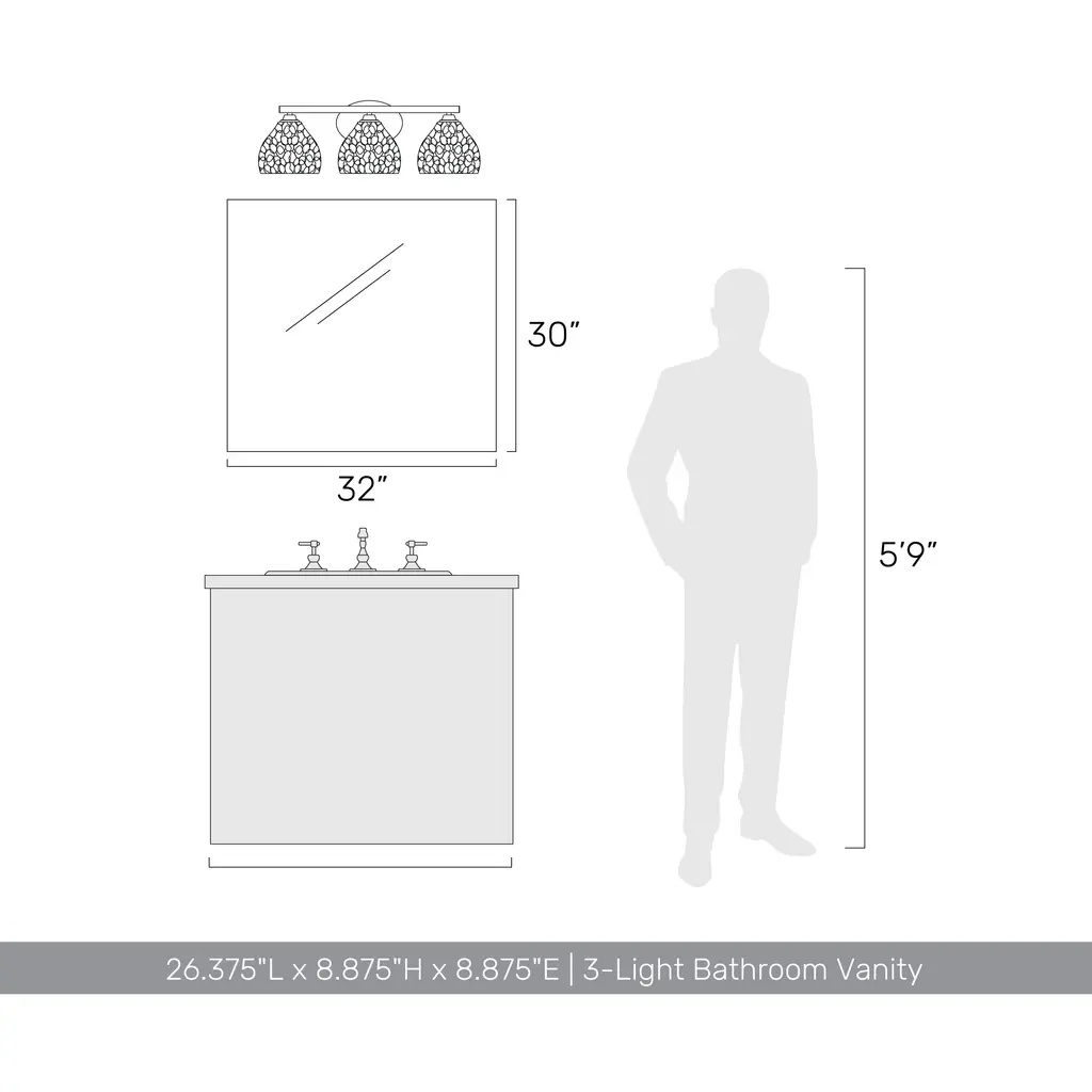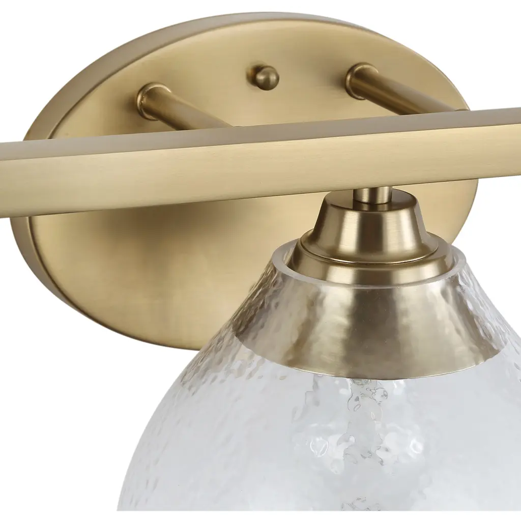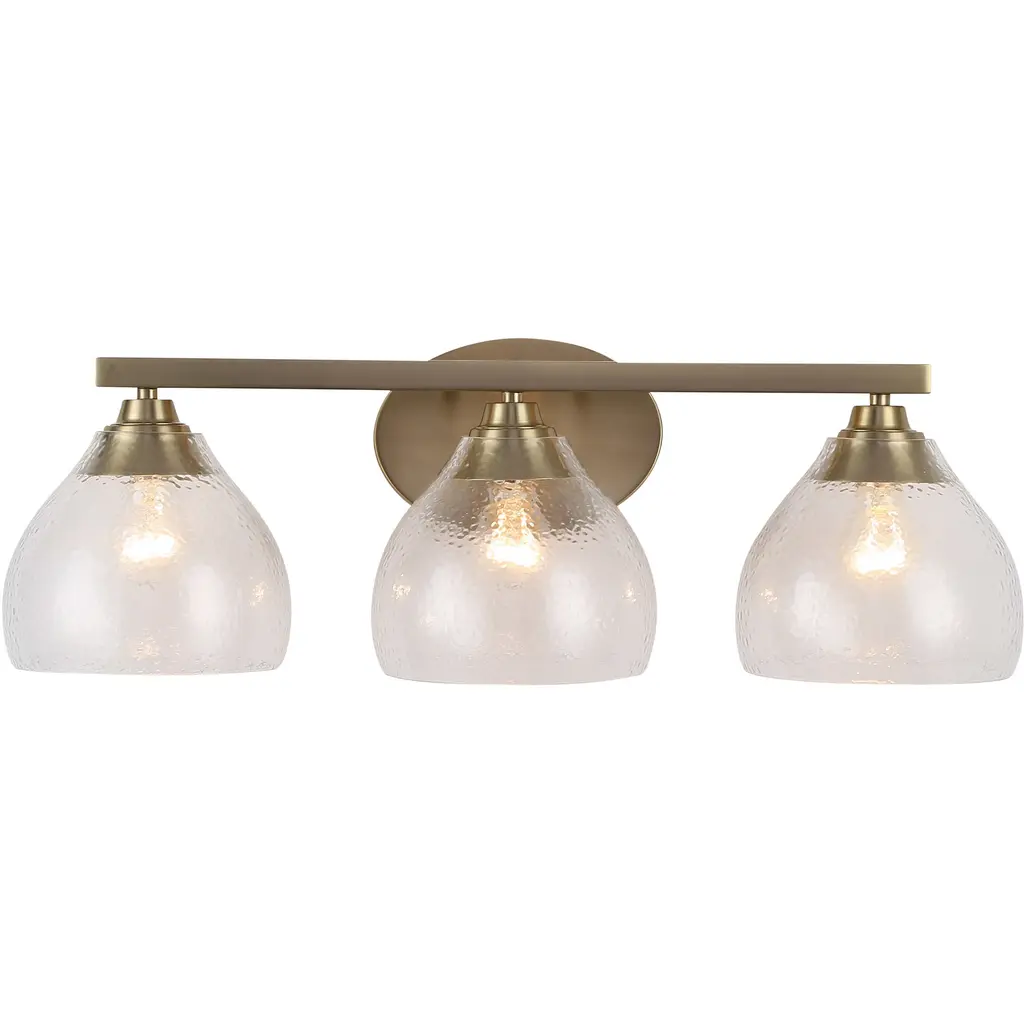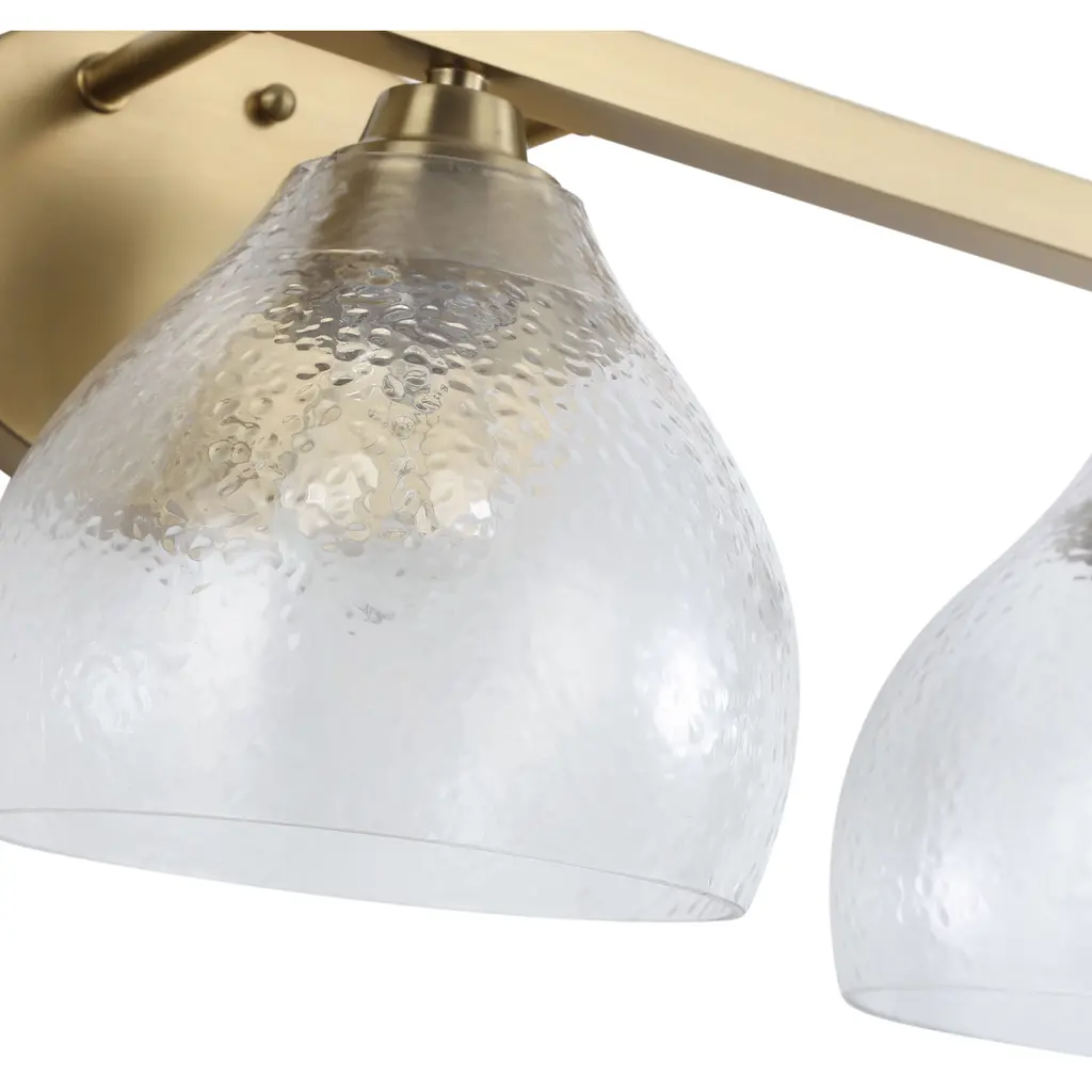 Bring Transitional elegance into your home with the Golden Lighting Ariella 3-light Vanity in Brushed Champagne Brass. Featuring a glass shade, it creates a welcoming atmosphere. The Hammered Clear Glass shade showcases a captivating texture that reflects light brilliantly. The sophisticated Brushed Champagne Brass finish provides a chic alternative to gold, ensuring a soft and warm ambiance. Rated for damp locations, the fixture is perfect for bathrooms or other moisture-prone areas. It requires 3 E26 Medium base bulbs (not included, max 60 watts per bulb), and its overall dimensions are 26.38"W x 8.88"H x 8.88"D. Discover a blend of elegance and quality with Golden Lighting.