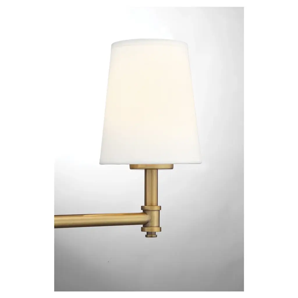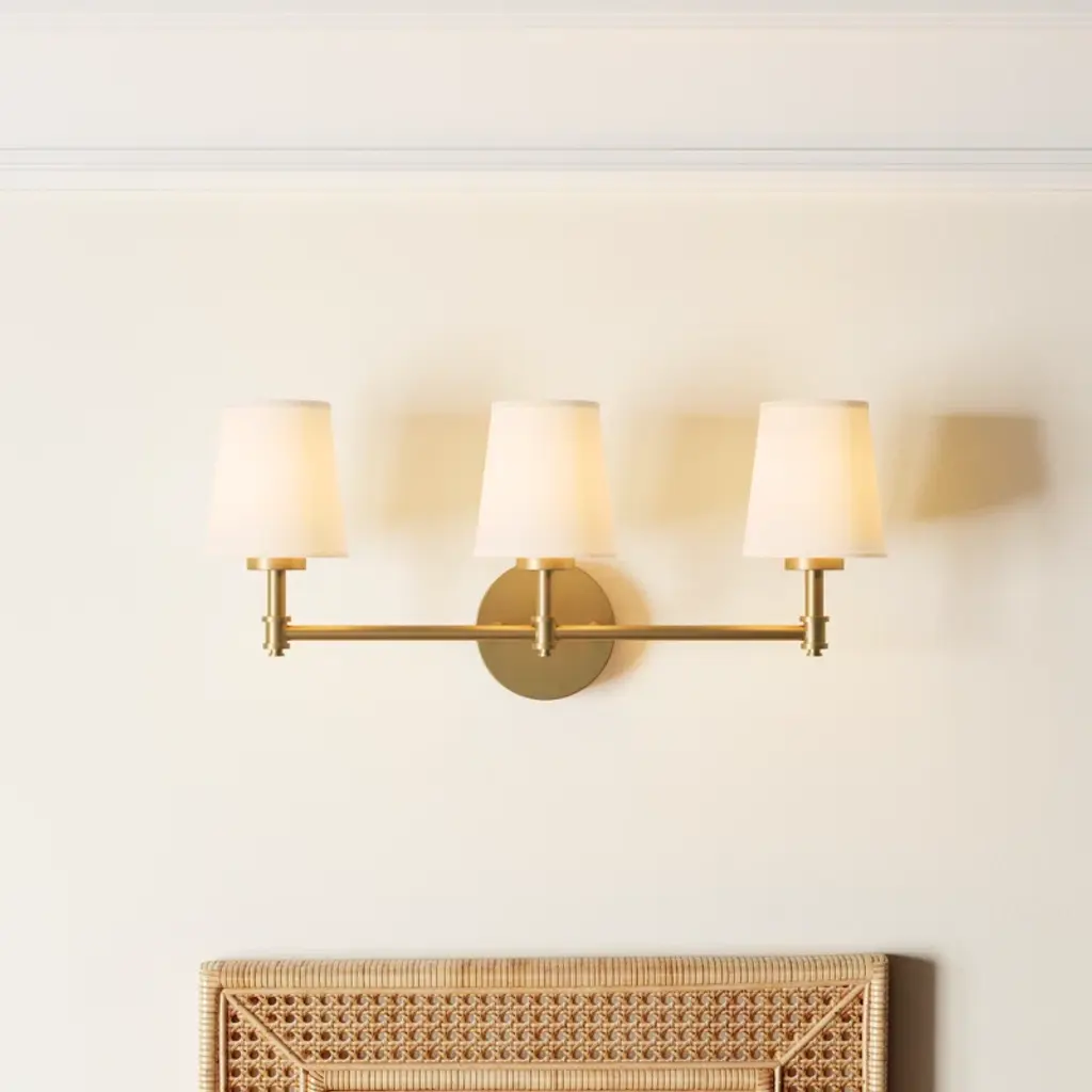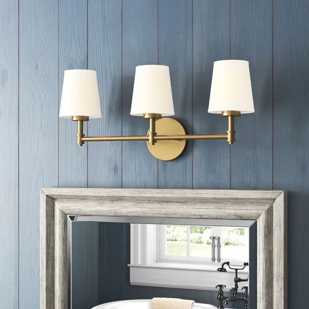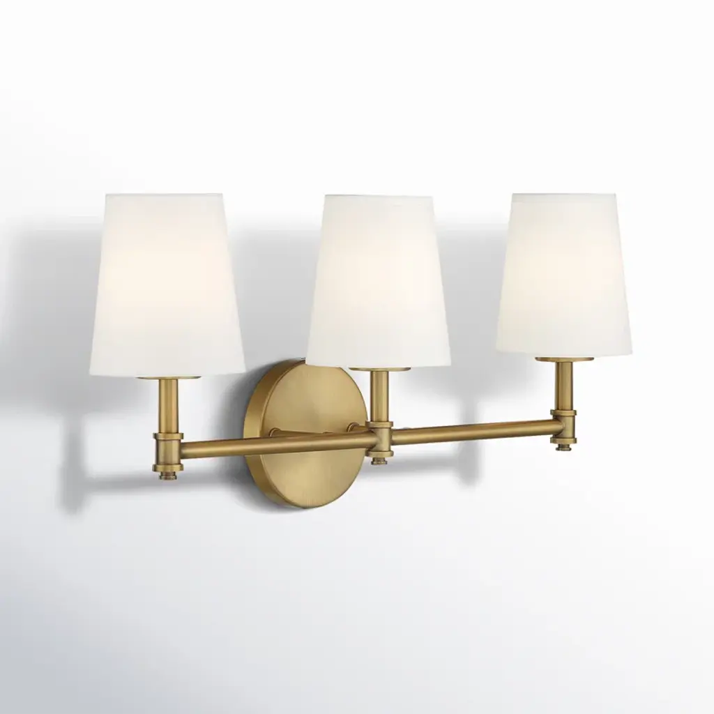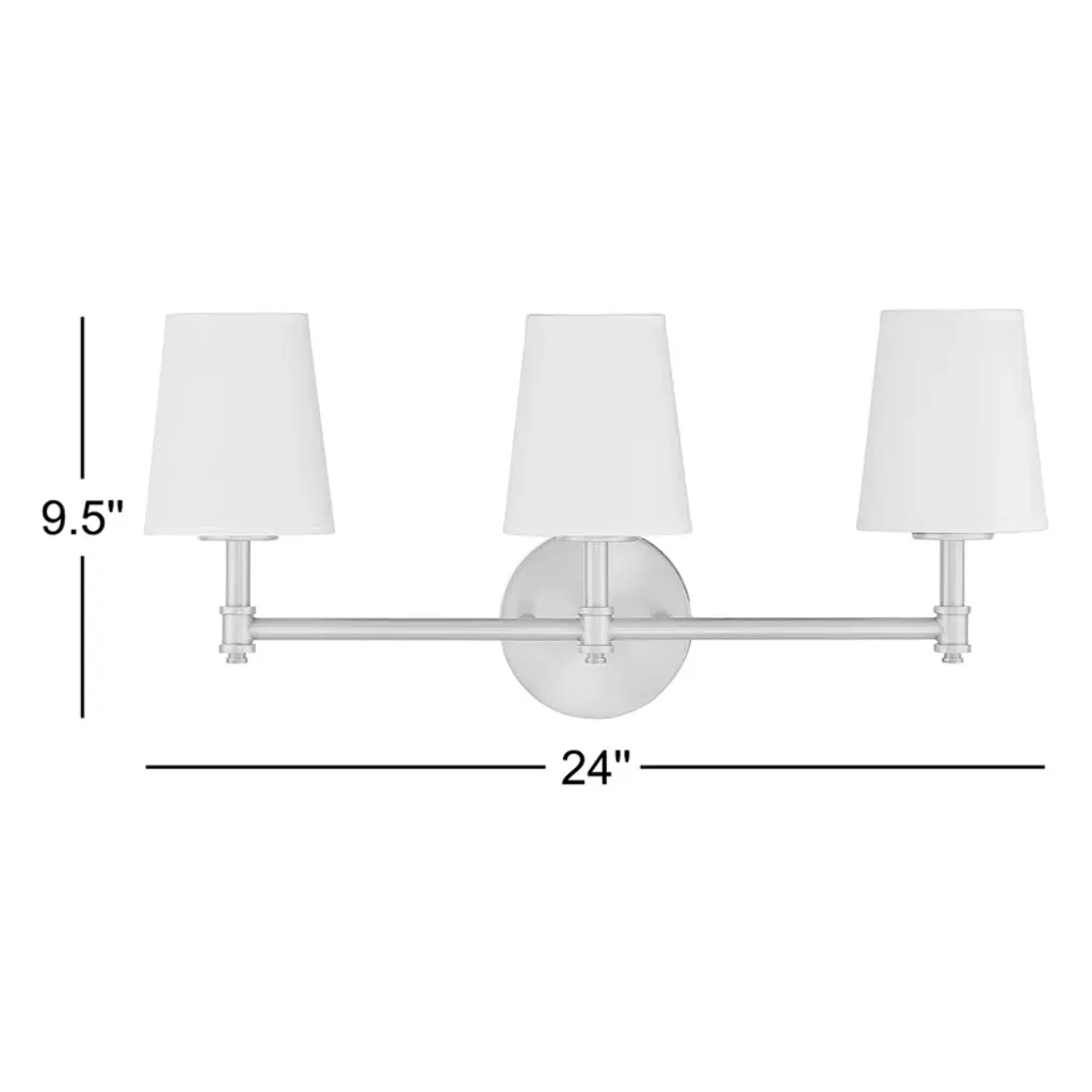 This 3-light bath vanity light is big in tailored traditional style! Featuring white linen fabric shades, a simply pleasing look and a natural brass finish. 9.50" height, 24" width, extends 7" from wall. Max 60 watts per bulb, candelabra size C11 bulbs recommended. LED bulb compatible. Damp area rated.