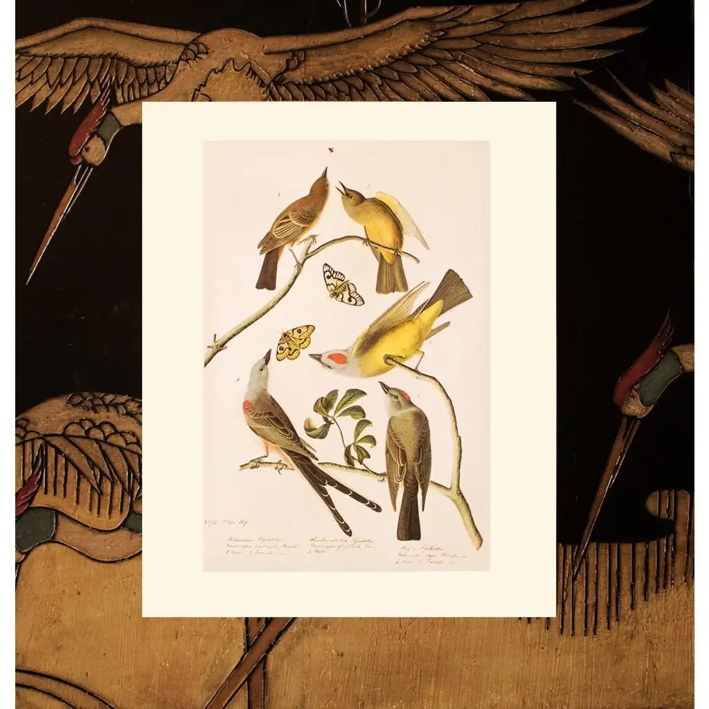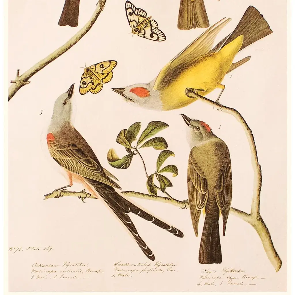 A stunning vintage American Classical, English Traditional, Chinoiserie, Cottage or Farmhouse Style reproduction of the original lithographic print of Arkansaw Flycatcher, Swallow-Tailed Flycatcher, and Say's Flycatchers after John James Audubon. Comes from The Birds of America book by Audubon, published in the U.S. in 1966. Signed in the print. Very detailed. Colors are brilliant. Excellent condition, never framed.