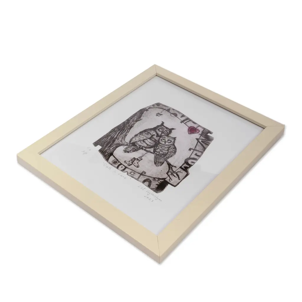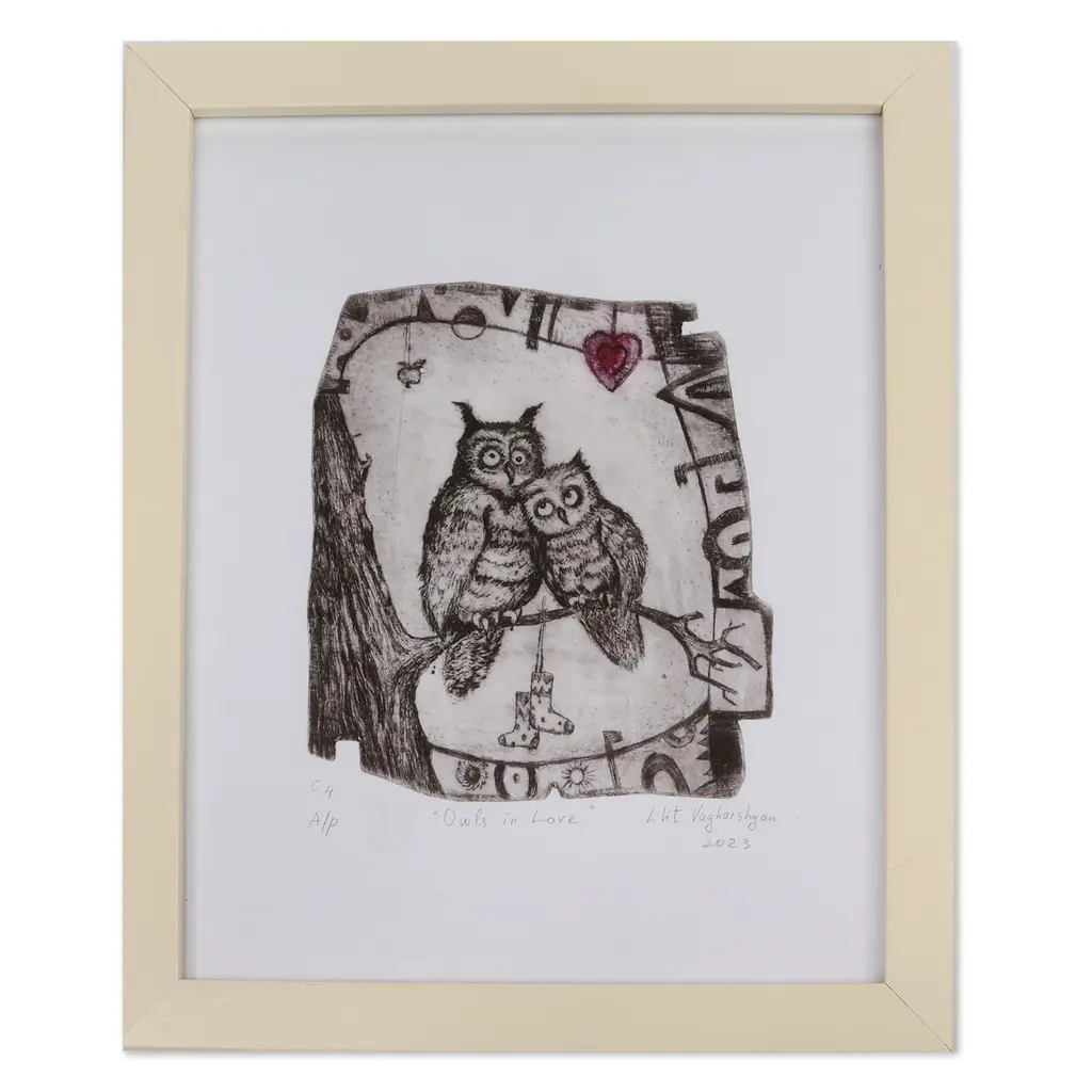 Wisdom allows love to survive time, as this intaglio print by Lilit Vagharshyan shows through whimsical details. The Armenian artist uses ink on paper to portray a couple of owls in love, spreading a tender message in honor of romance.This signed print has an acrylic frame.