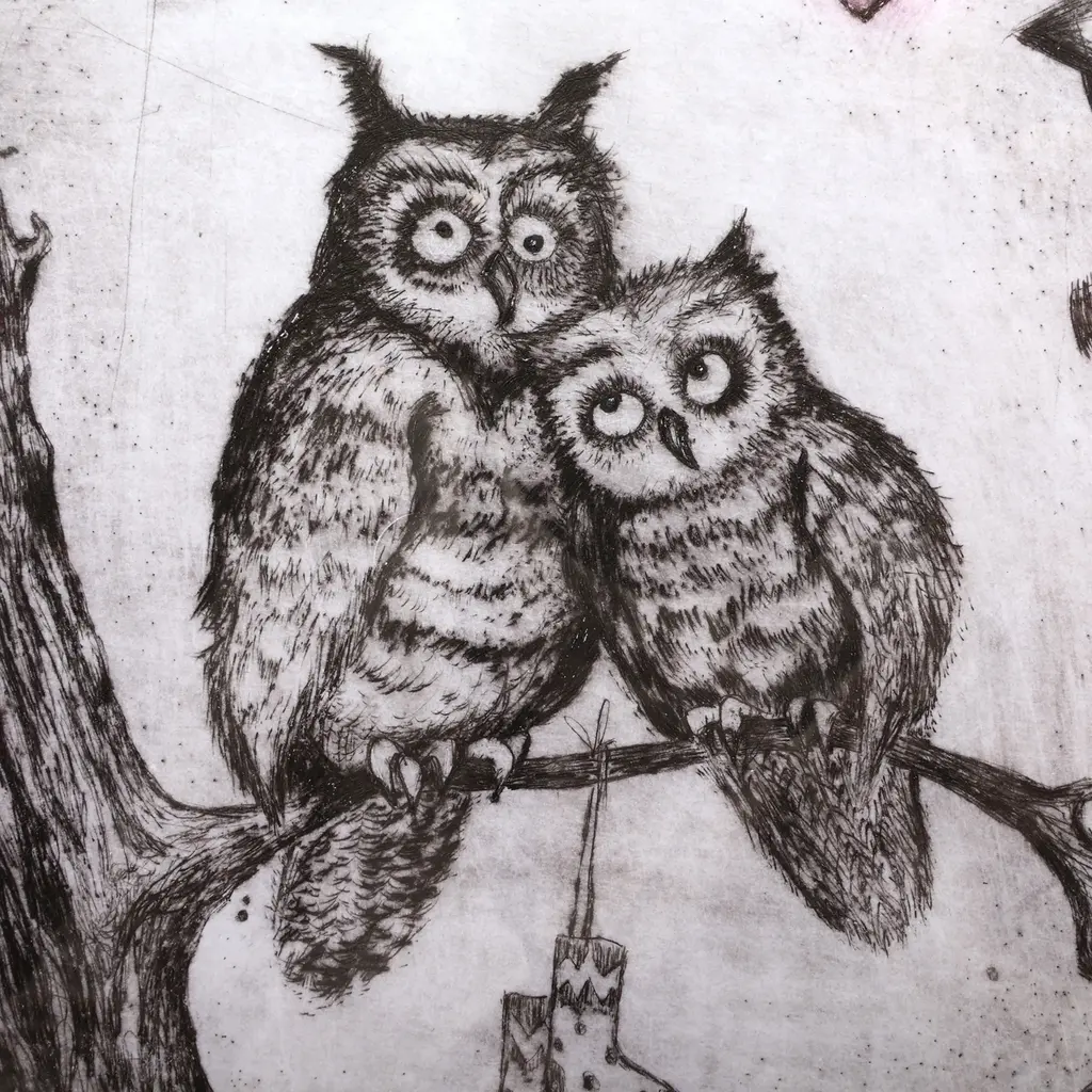 Armenian Ink On Paper Intaglio Print Of Romantic Owl Couple- Owls In Love