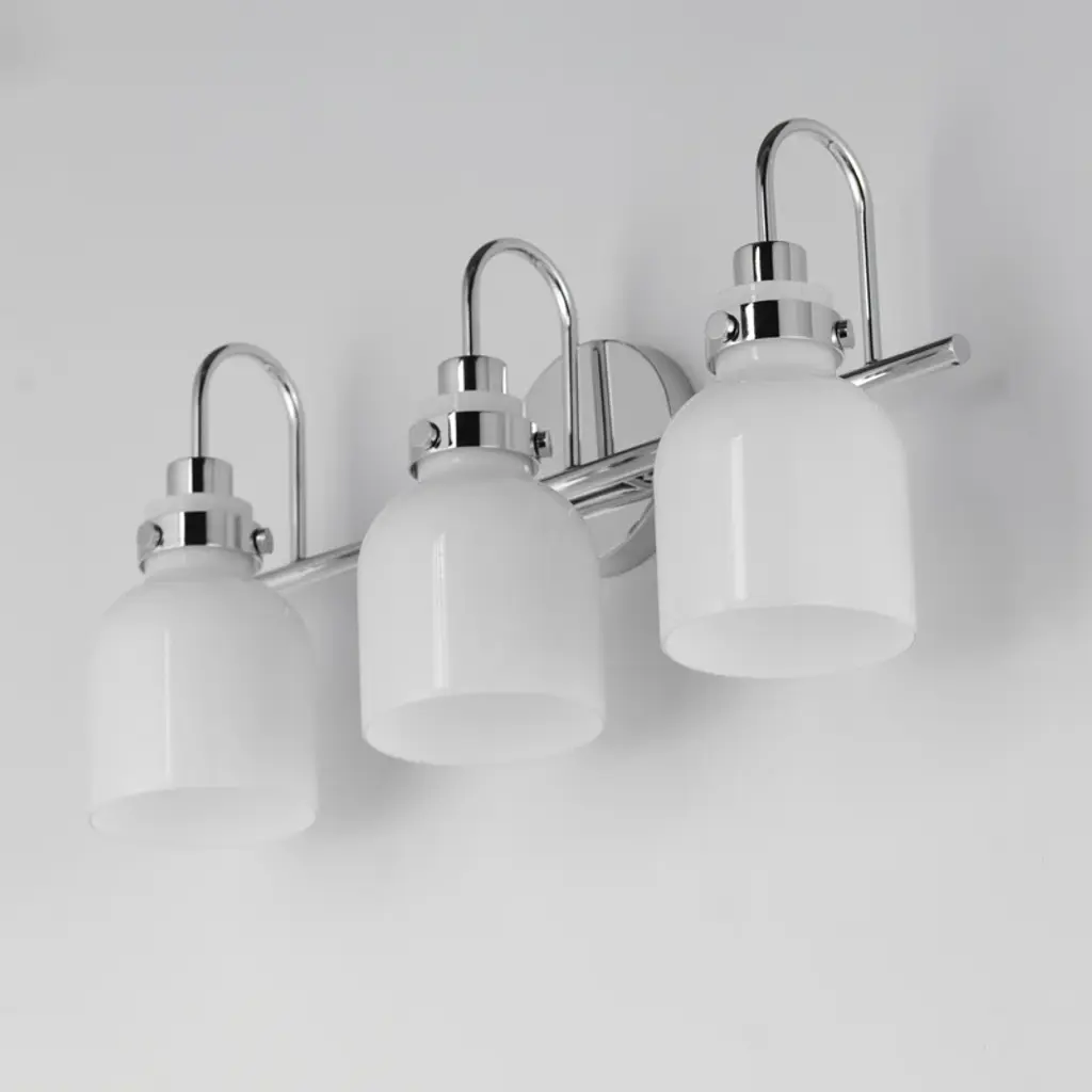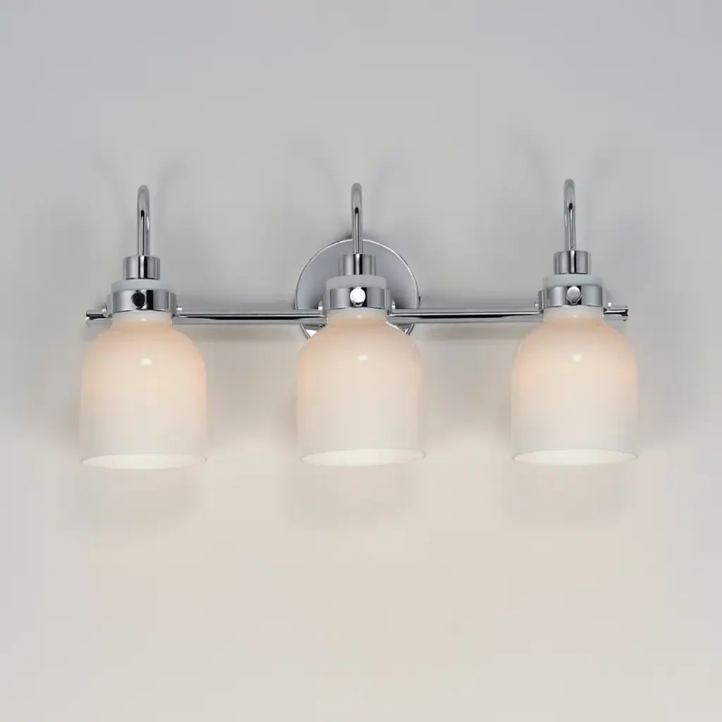 Celebrate nostalgia using these sconces that feature opal White glass shades in a bell shape. Supported by rings of metal, this refreshing take plays into a retro aesthetic of your bathroom decor.