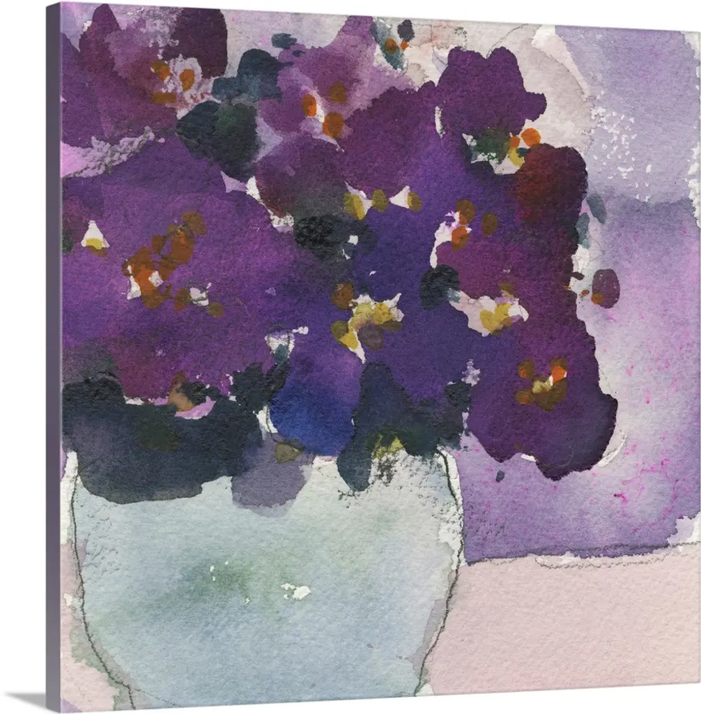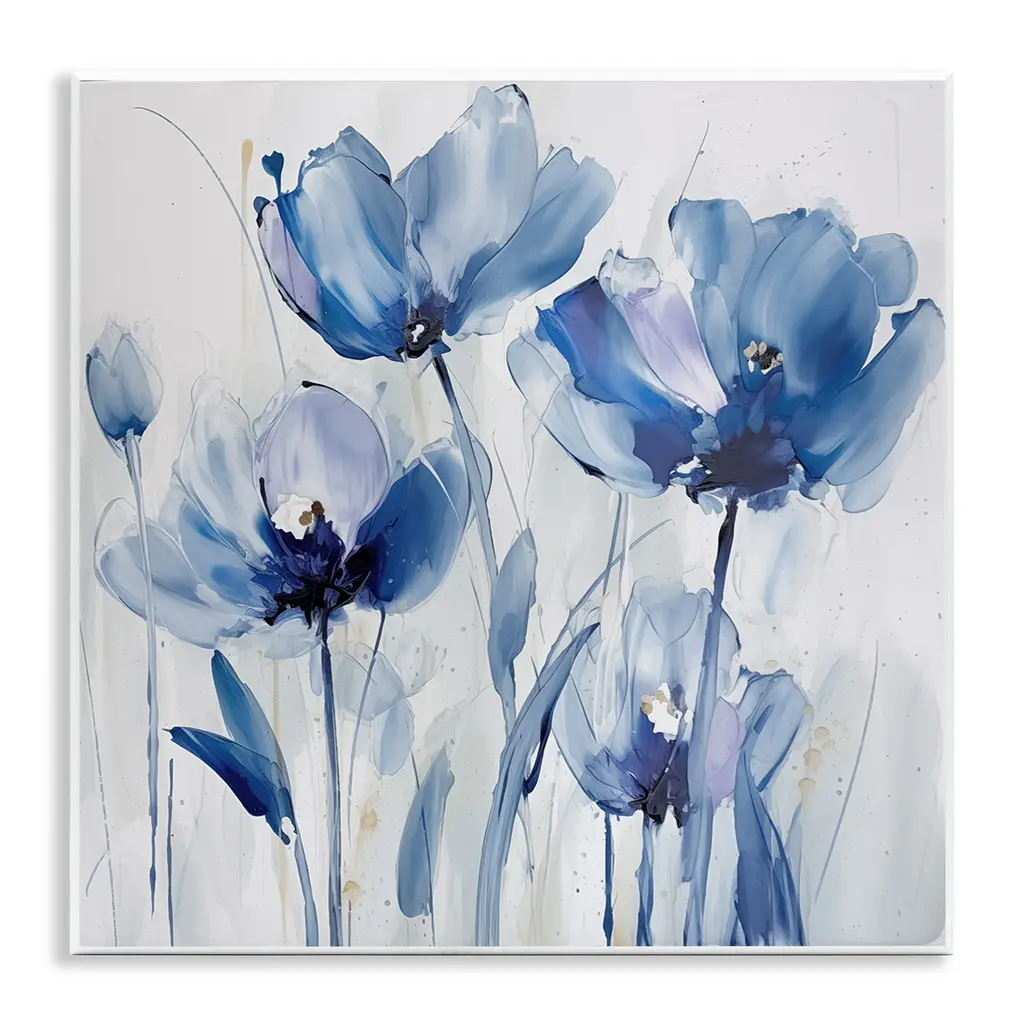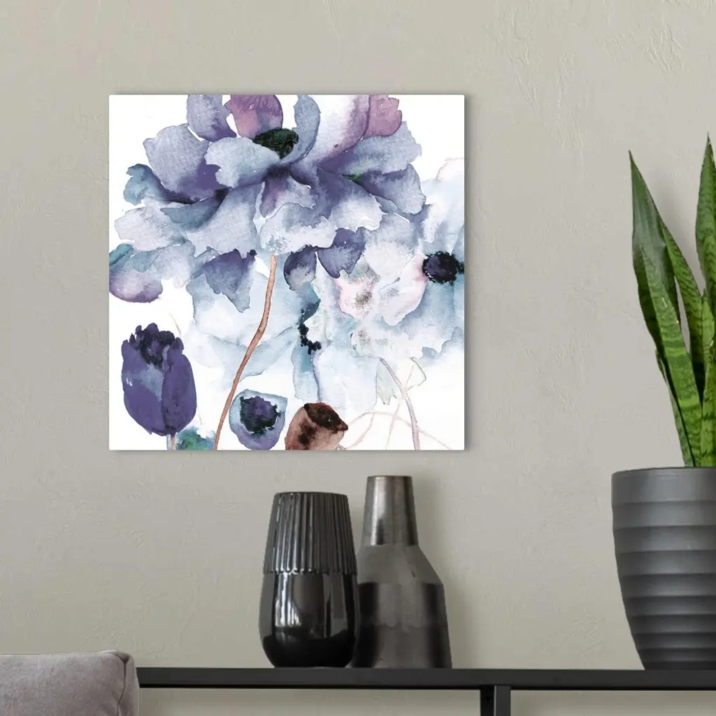 Contemporary watercolor painting of pale blue flowers with broad petals.