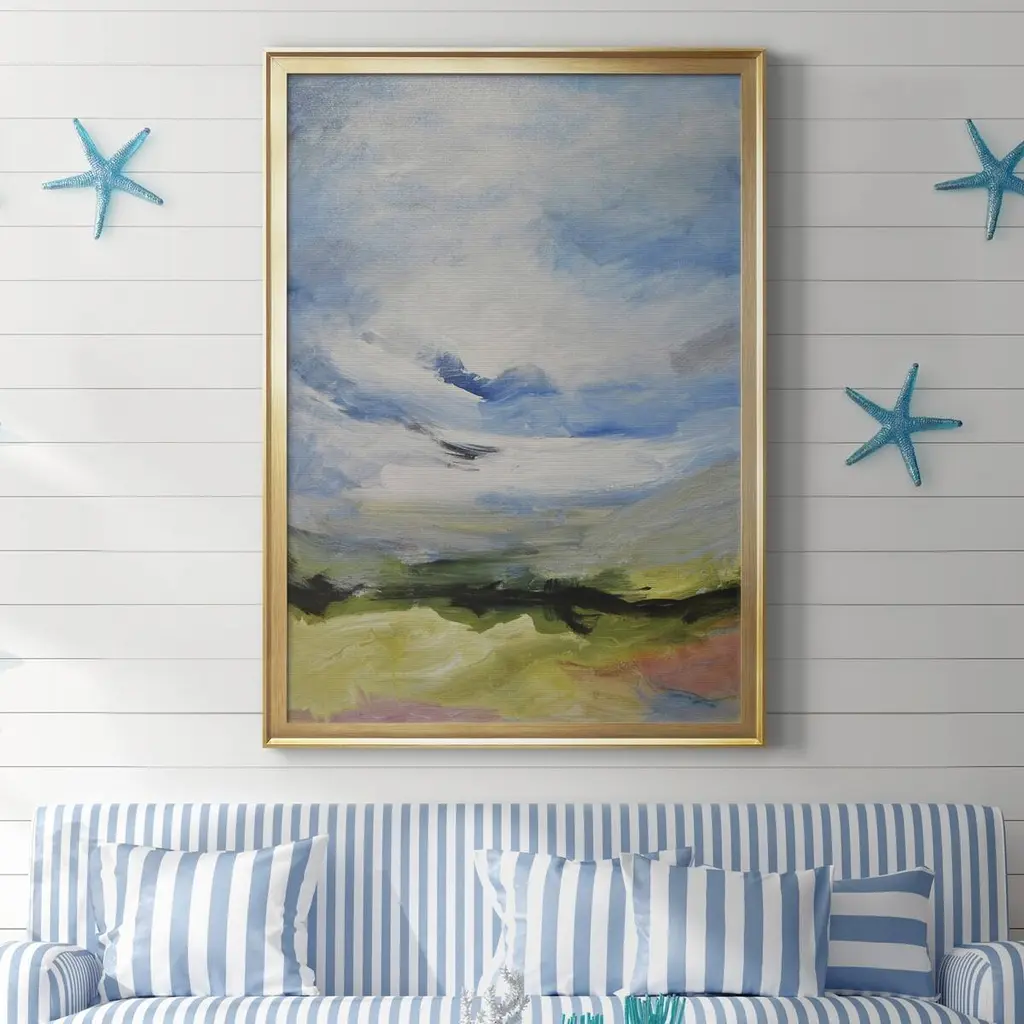 AROUND THE CLOUDS IV Premium Framed Canvas - Ready to Hang A Premium Framed Canvas created to last. Framed in distressed wood and available in an array of sizes and colors Featuring a beveled a solid wood stretcher bar, each piece comes ready to hand 4 SIZES AVAILABLE 30.5''X42.5'' - Overall Size 26.5'X36.5'' - Overall Size 22''x30'' - Overall Size 18''x24'' - Overall Size Each piece is made to order. Each piece comes with hanging hardware. Made in the USA Ready to Hang Giclee Paper Print Acrylic Glass Beveled Matt Board