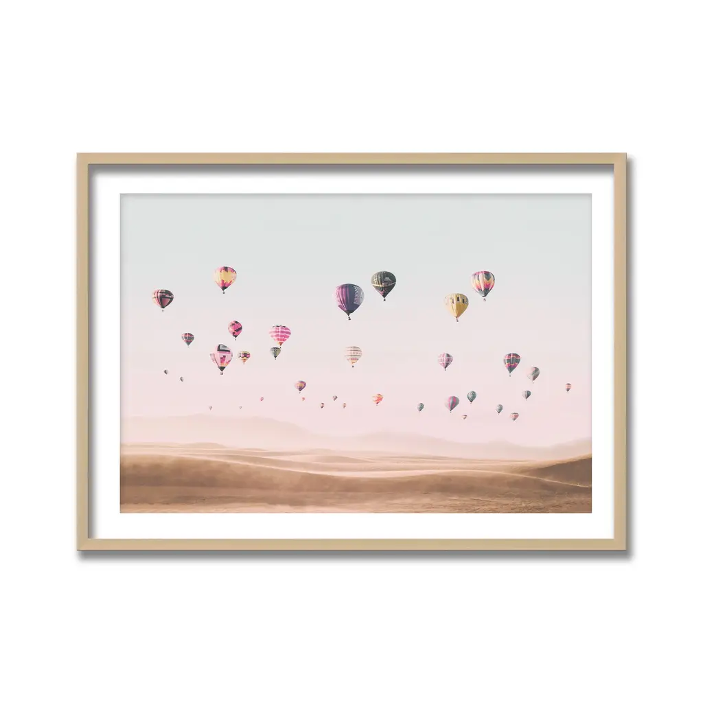 Infuse any space with the essence of this trendy framed print wall art titled "Around the World" by Kathrin Pienaar. The piece features a group of hot air balloons filling up the sky the dreamy pink and blue skies that will complement any modern space. Handcrafted in Chattanooga, Tennessee, by Ready2HangArt using a locally sourced artist print, finished with a rear hanger for simple installation.