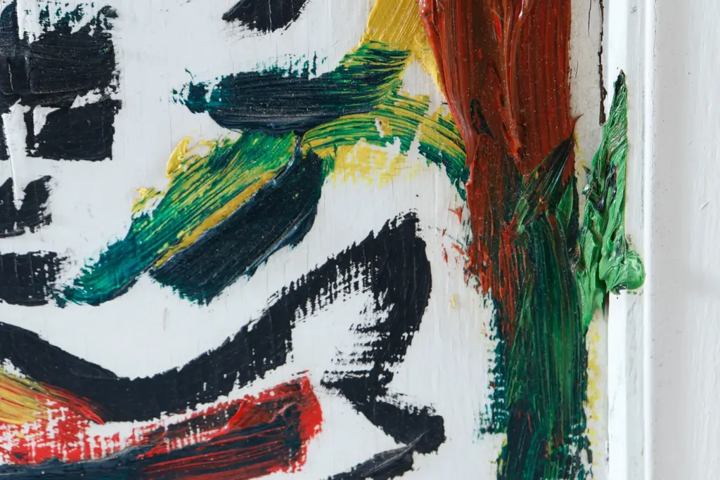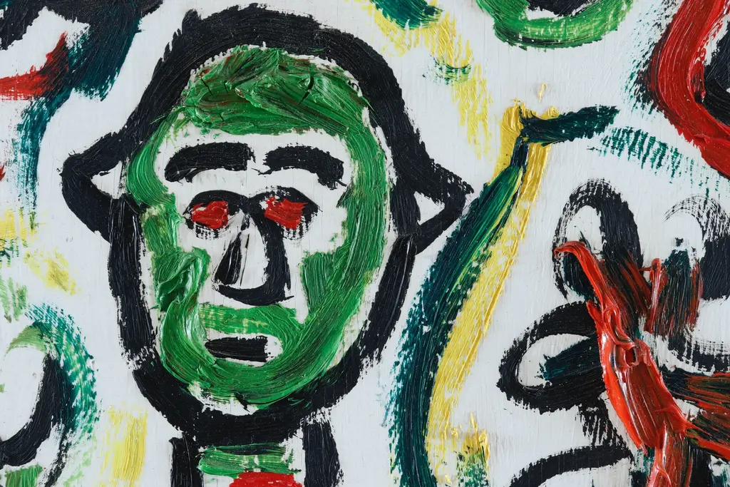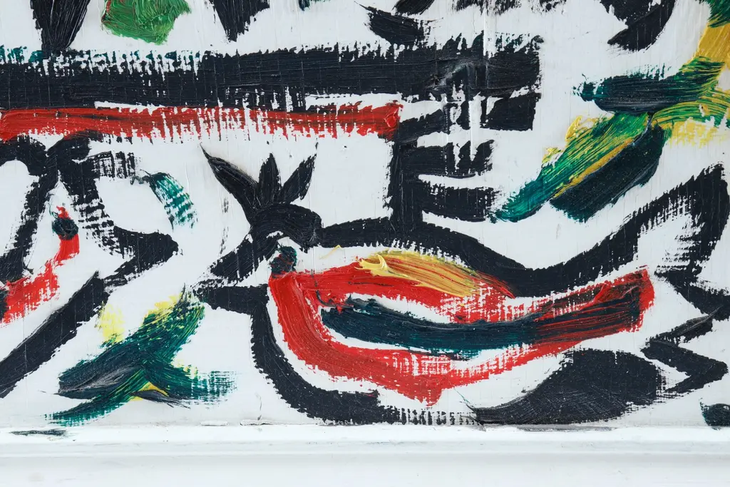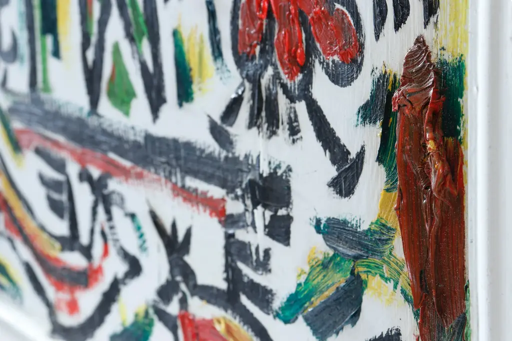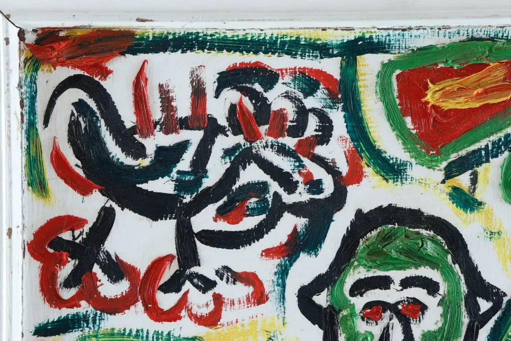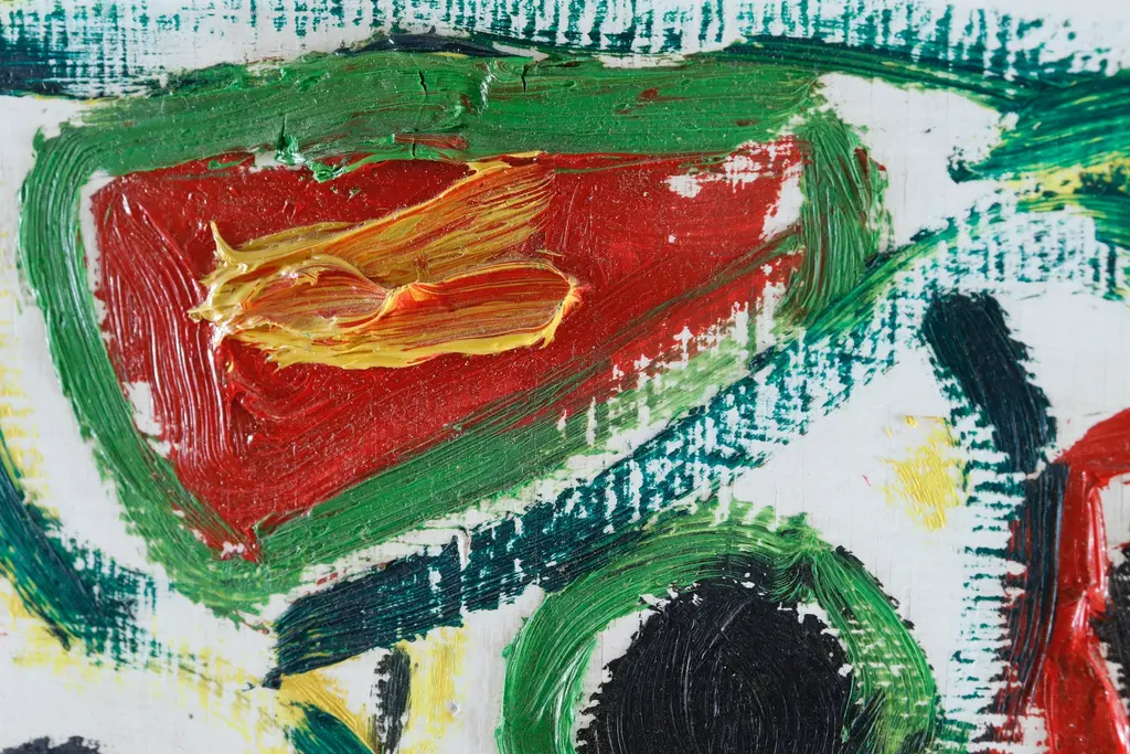 An original framed abstract �����Art Brut��� acrylic on artist board. Depicts a Shepherd (identifiable by his crook), surrounded by birds and other shapes, boldly and simply formed in black, red, yellow, and green. Unsigned, circa 1970.