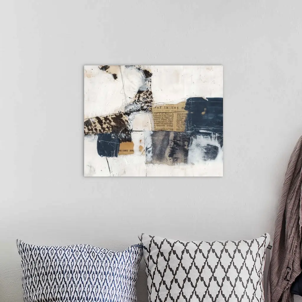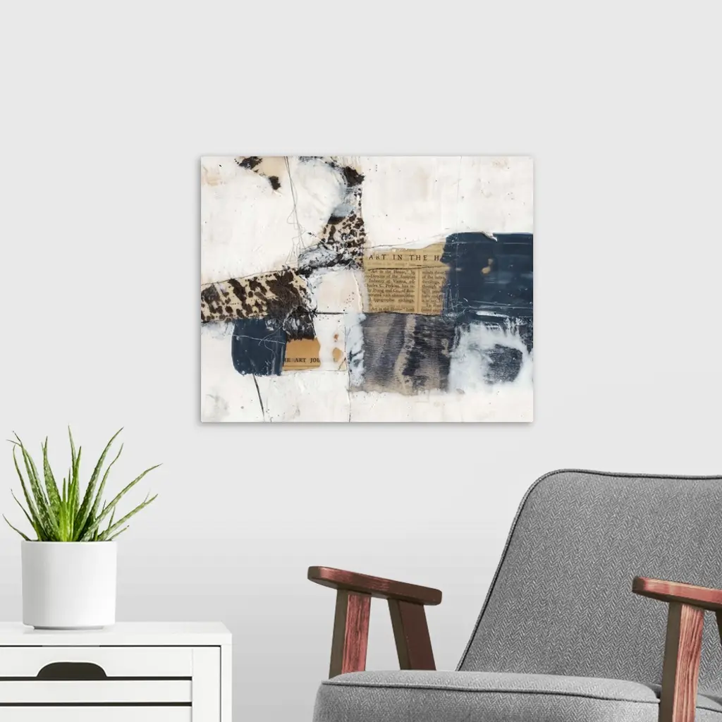 Contemporary abstract collage style artwork using print clippings and muted tones.