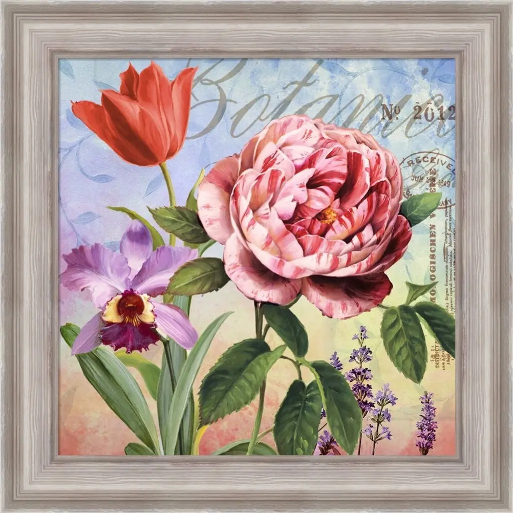 Botanique with Rose by Art Licensing Studio is a high quality piece of framed artwork. The finished size of this piece is 20" X 20". It has a Weathered White Distressed frame and is finished with high quality Acrylic Plexiglass.. 100% Satisfaction Guaranteed.