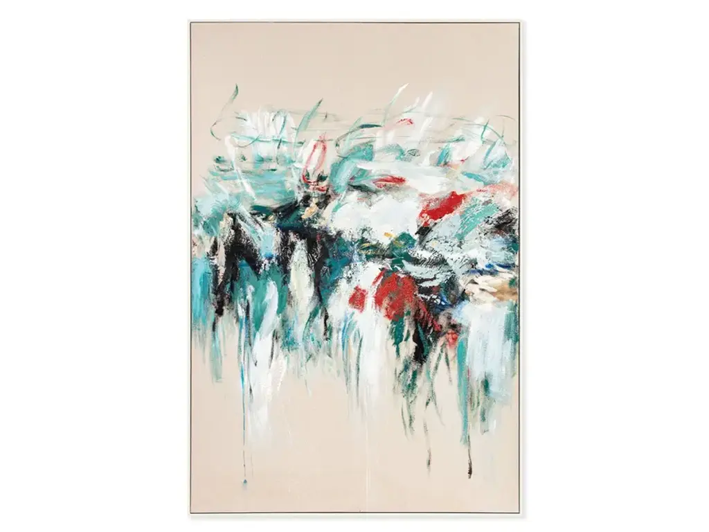 This handmade oil painting has a variety of colors that will bring your room together. Each painting is made unique per piece and is not printed on. This art piece has colors of red, blue and white. This wall art has hanging hooks provided on the back and a silver wood frame as well.