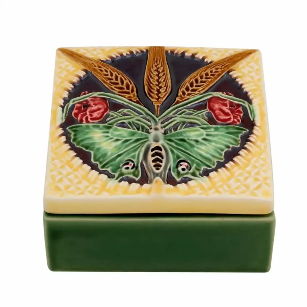 Raphael Bordallo Pinheiro produces a remarkable production of blue tiles for the interior and exterior coating treated as decorative elements of great importance. Of the tiles with relief, either with patterns or figures, it is important to highlight the originality and quality of the glazes applied manually. The blue tile of the big frog (1884 – 1905) is a representation of naturalism and Art Nouveau by Raphael Bordallo Pinheiro, being most recently used as a box lid. Earthenware. Hand crafted and painted in Portugal. Portugal's most beloved cartoonist of the 19th century, Bordallo Pinheiro was famous for creating the character "Ze Povinho," a rustic laborer who was kind to his friends and contemptuous of those with money and power. His artistic style blends the honesty realism of late 19th-century Arts and Crafts movement with the dramatic, even grotesque, features of Goya's earlier paintings. In 1884, he and his son founded an eponymous factory in Caldas da Rainha along the Portuguese coast to create whimsical and naturalistic faience pieces based on his art. Because of the special minerals in the local soil and the skills of the craftsmen in the area, Caldas da Rainha is well-known as the capital of Portuguese pottery. Today the factory takes Pinheiro's original style into the 21st century with satirical portraits of modern day celebrities, while continuing its old fashioned, made by hand tradition of Portuguese pottery making.