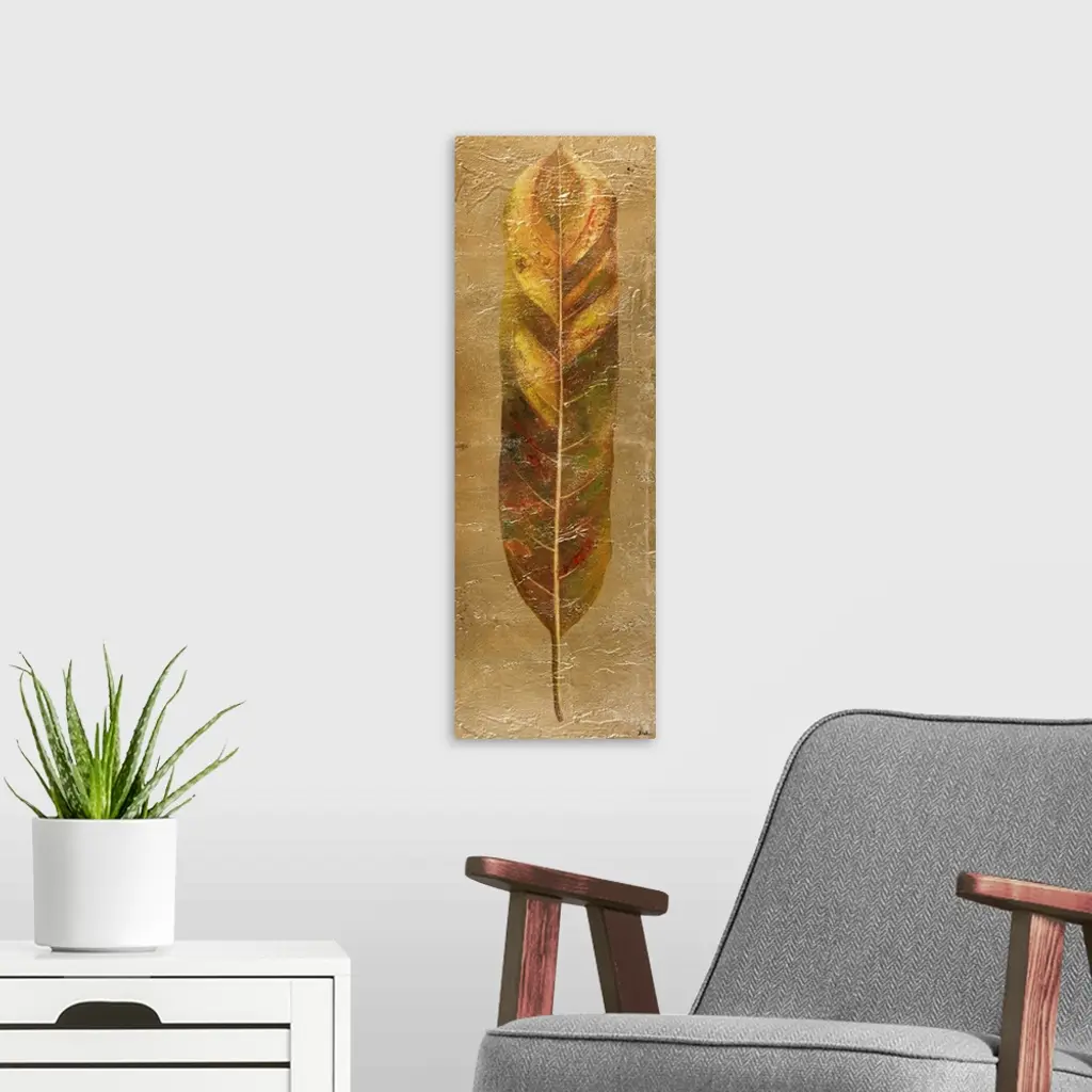 Contemporary painting of a broad leaf in gold tones.