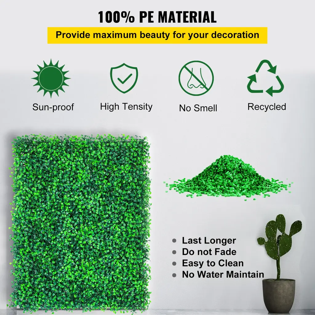 Premium PE Material: With SGS certification. Boxwood hedge wall panels are made of new PE high-density polyethylene (HDPE) material for long last, no smell, low-maintenance, eco-friendly, and sunproof to maximum beauty of your decoration for both indoor and outdoor. High-Density Boxwood Panel: For 24pcs 24" X 16" option: Size: 24'' x 16"; Quantity: 24 pcs; Covering: 64 sq.ft; Thickness: 1.6''. For 20 PCS 20"x20" option: Size: 20'' x 20". 1 set of 20 boxwood panels cover 54 square feet of space. 48pcs 10X10" option: Size: 10'' x 10". Quantity: 48 PCs. Thickness: 1.6''. 8pcs 24X16 option: Size: 24'' x 16". Quantity: 8 PCs. Thickness: 1.6''. For 6 PCS 20\"x20\" option: Size: 20'' x 20". 1 set of 6 boxwood panels cover 16.2 square feet of space. For 12 PCS 20\"x20\" option: Size: 20'' x 20". 1 set of 12 boxwood panels cover 32.4 square feet of space. For 14 PCS 20\"x20\" option: Size: 20'' x 20". 1 set of 14 boxwood panels cover 37.8 square feet of space. For 16 PCS 20\"x20\" option: Size: 20'' x 20". 1 set of 16 boxwood panels cover 43.2 square feet of space.Our artificial boxwood panel comes with bright green color and a soft feel. It shows a more realistic appearance through 1.6" tall(40 mm), 4 layers of leaves, no plastic blurs, and denser panels(19 grids per row, and 400 stitches per panel). Leaves are placed closely to create better privacy for you and your family. Stable Panel Base Structure: The thickened PE rivets are inverted triangles that cannot fall off the wall. On the back of each boxwood panel is a cuttable and bendable grid. You also can cut it, fit and shape it to any space. Ease of Installation: Each panel features interlocking connectors that allow you to connect the boxwood wall panel to any wood frame or link fence. 100 x zip ties are included for you to fix the panel to any place easily and without any tools. 2 x rattans and 4 x artificial flowers are a gift for matching your decor. Outdoor & Indoor Usage: Start your DIY projects! Perfect for adding privacy to an outdoor area, like the fence, wall, patio, garden, yard, walkways, backdrop. It also can be used in the living room, balcony, office area, reception desk, holiday party event, and more. 24pcs 24" X 16" Package Content 24 x Artificial Boxwood Panels 100 x Zip Ties 8 x Artificial Flowers 48pcs 10X10" Package Content 48 x Artificial Boxwood Panels 100 x Zip Ties 4 x Artificial Flowers 8pcs 24X16 " Package Content 8 x Artificial Boxwood Panels 100 x Zip Ties 2 x Artificial Flowers 20"x20" Package Content 20 x Artificial Boxwood Panels / 6 x Artificial Boxwood Panels / 12 x Artificial Boxwood Panels / 14 x Artificial Boxwood Panels / 16 x Artificial Boxwood Panels 100 x Zip Ties 4 x Artificial Flower 2 x Rattans 12PCS 10x10 inch Package Content 12 x Artificial Boxwood Panels