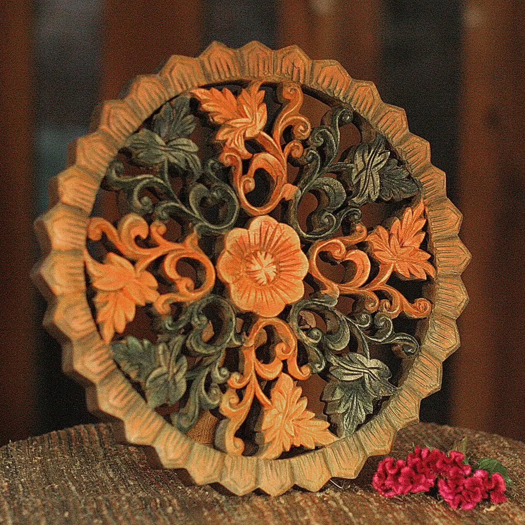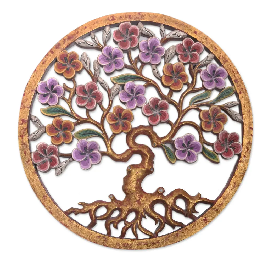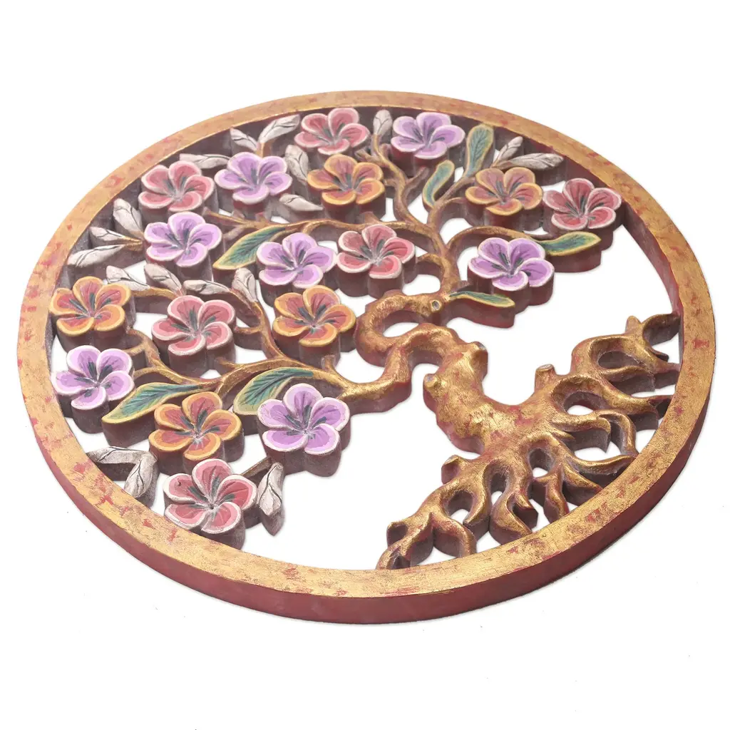 Covered in bright red and purple flowers, Ketut Sudantara's relief panel provides a pop of beautiful color to your home decor. The Balinese artisan hand carves the round panel from local suar wood, painting the openwork tree motif with shimmering golden accents.