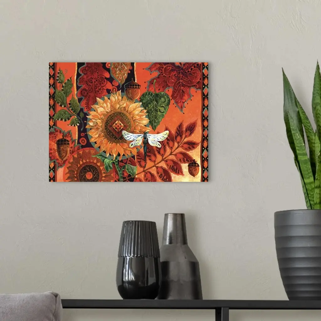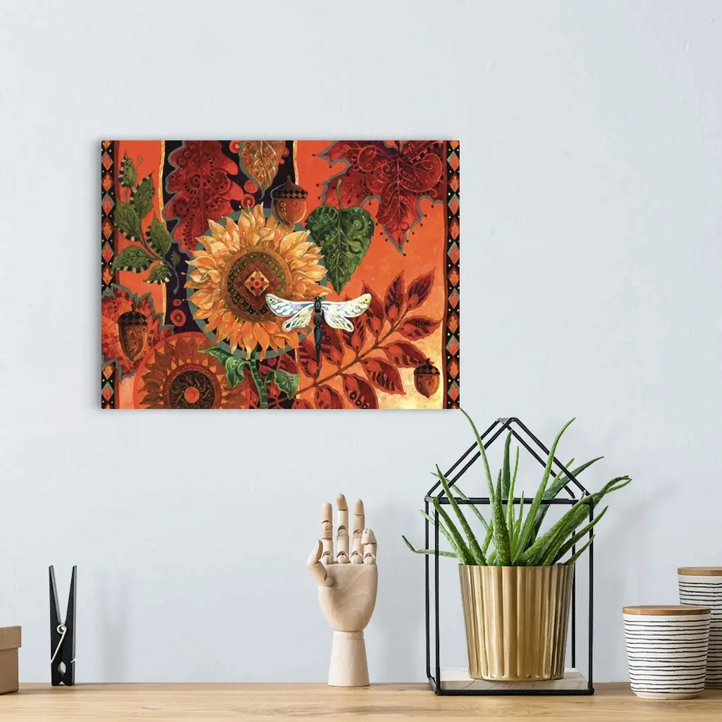Contemporary artwork of autumn flowers and warm earthy tones.