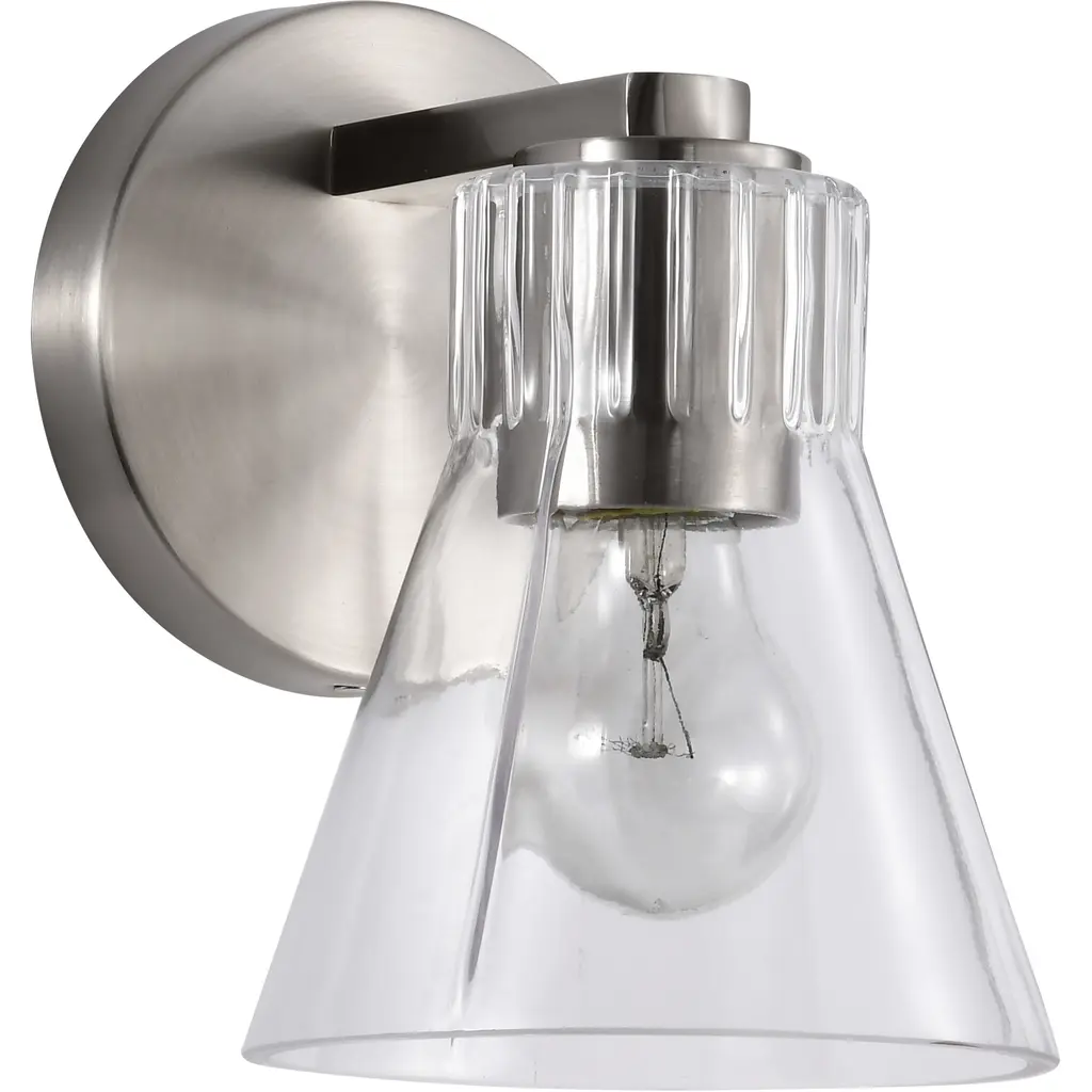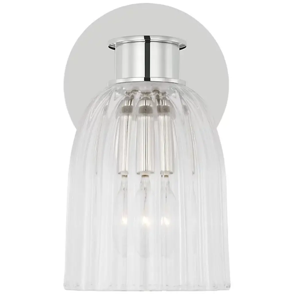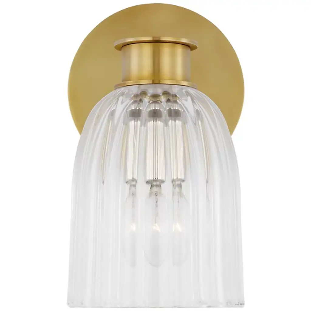 The Asalea 1 Light Vanity Light from Visual Comfort Signature features refined elegance, elevating interior walls with its understated, captivating charm. Extending from a stepped circular wall plate, a short horizontal bar extends to a single downward-facing lamp, enclosed within a glass dome shade adorned with vertical ribbing. Damp-listed for versatile indoor use, this fixture designed by Aerin seamlessly merges transitional elements with modern sophistication and a minimalist ethos. A simple design crafted from luxurious brass and glass offers an engaging blend of direct illumination and ambient light, effortlessly complementing diverse indoor decor styles.