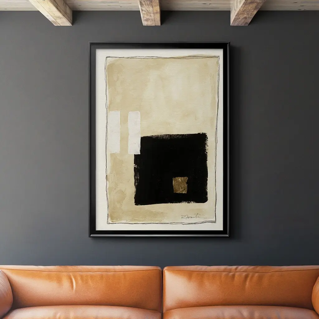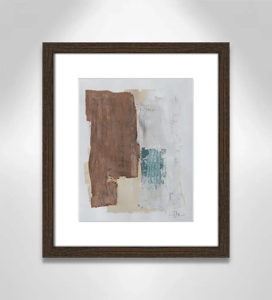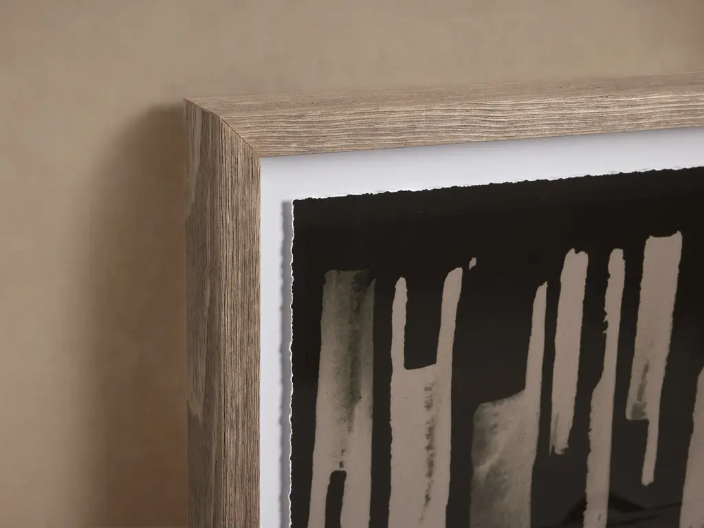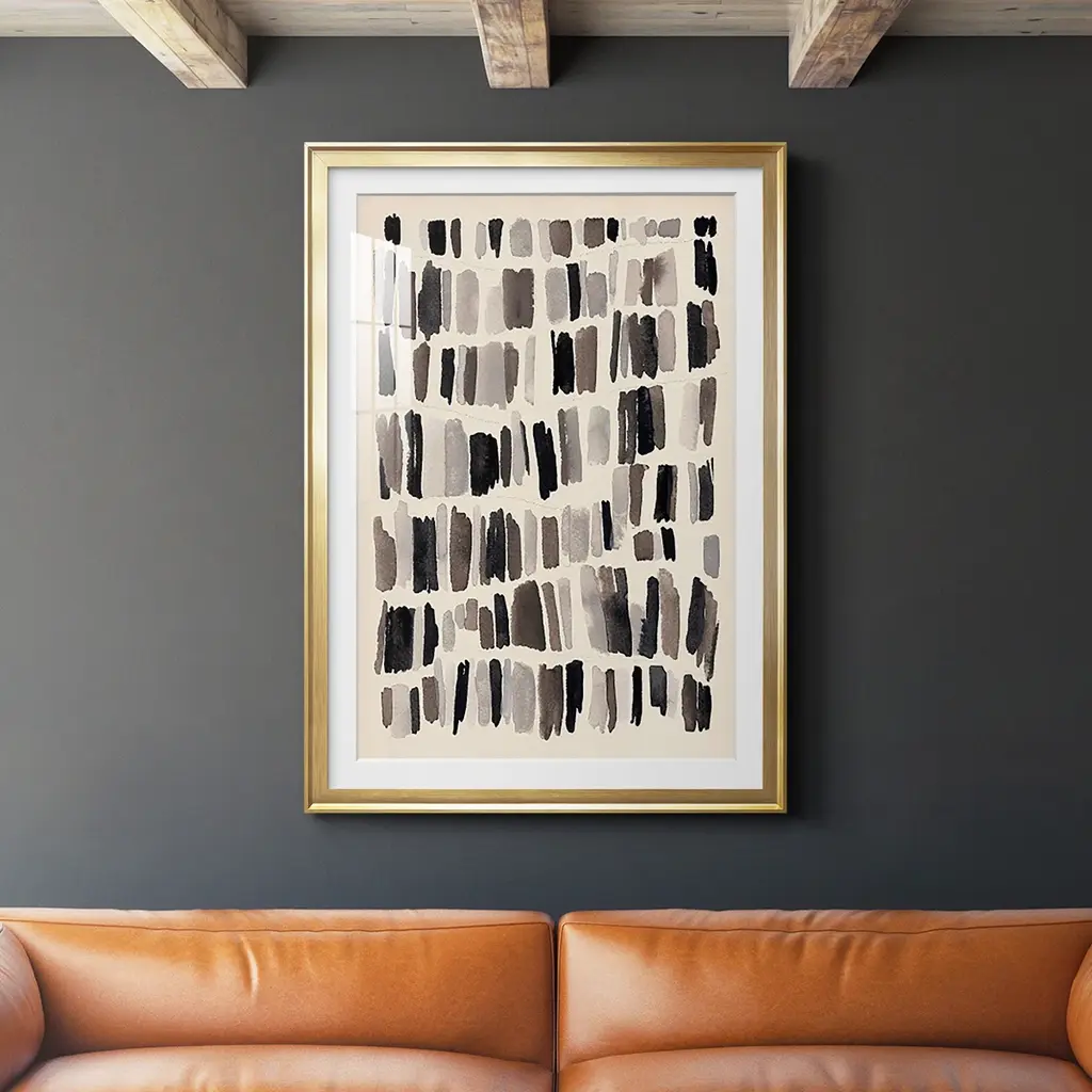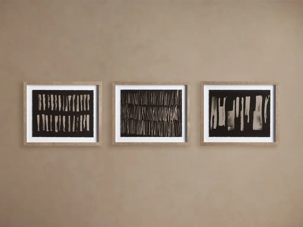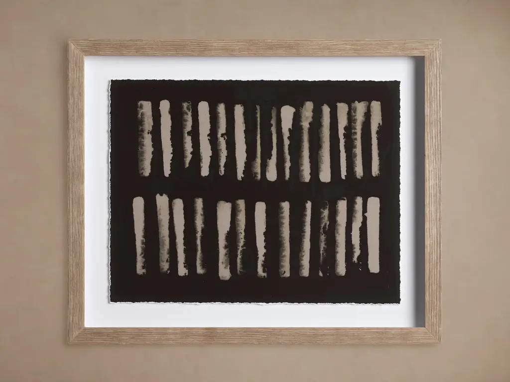 A series of dramatic statement pieces, each Ashen framed piece draws attention to linear forms in bold neutrals. Inspired by her childhood in Ohio as well as extensive world travels, Dawn Sweitzer uses abstract patterns that interact with materials, colors, textures, and finishes to arrange rich compositions.