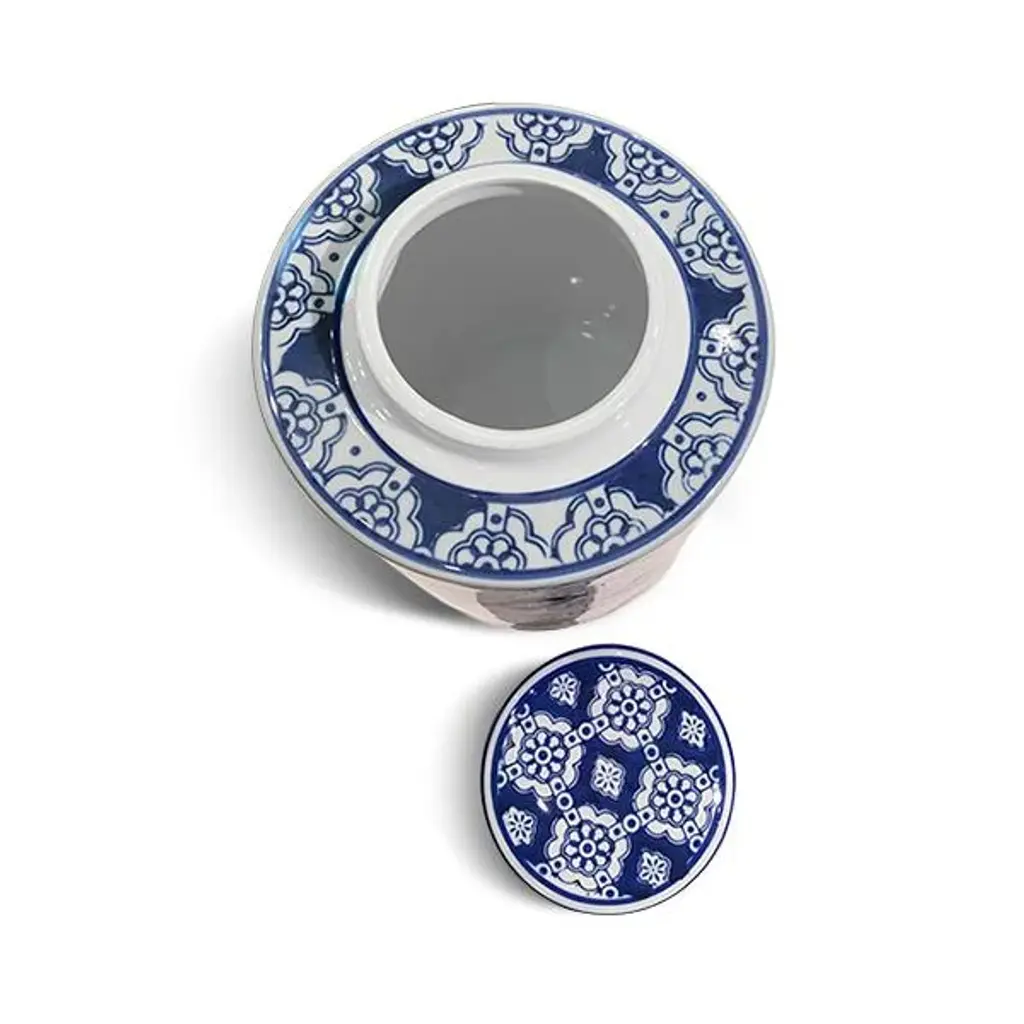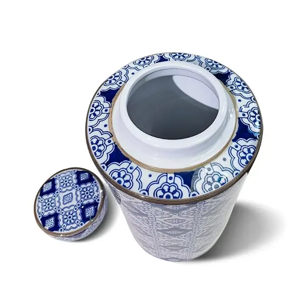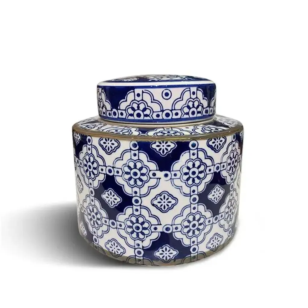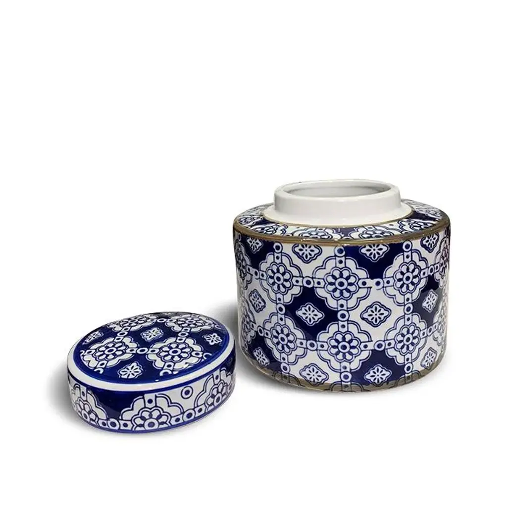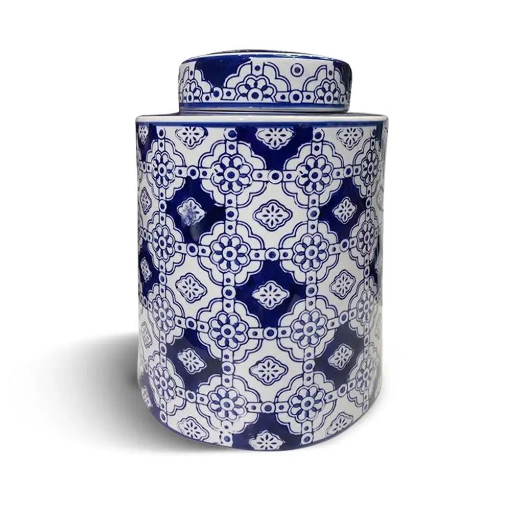 Asian Navy & White Diamond Print Porcelain Jars- Set Of 3