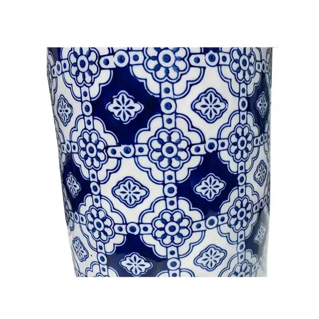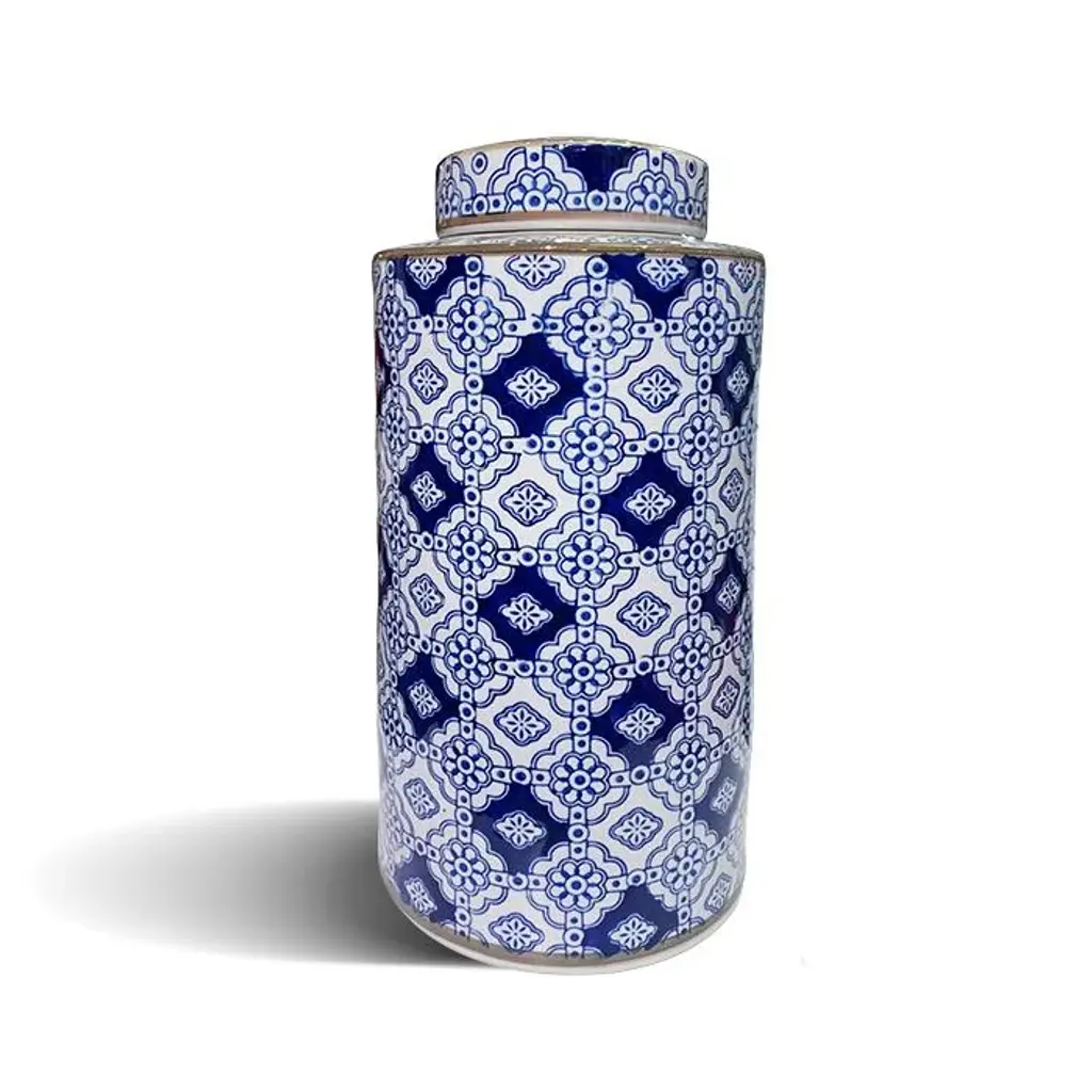 Asian Navy & White Diamond Print 16" Height vase can be use for indoor and outdoor. This piece used high fire porcelain is all handmade from China. This piece can be use as vase or other storages. It is good accent piece for home décor. We have 2 sets available. Material: Ceramic/Porcelain Dimensions: 7.5"W x 7.5"D x 16"H (Large Size) Dimensions: 7.5"W x 7.5"D x 11.25"H (Medium Size) Dimensions: 7.5"W x 7.5"D x 7"H (Small Size) Origin: China Condition: Perfect condition, no cracks or chips.