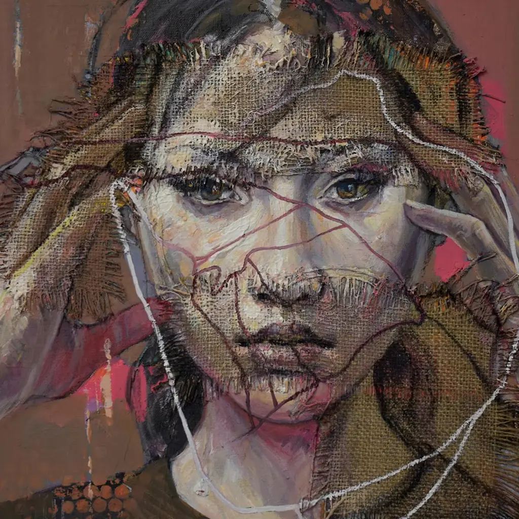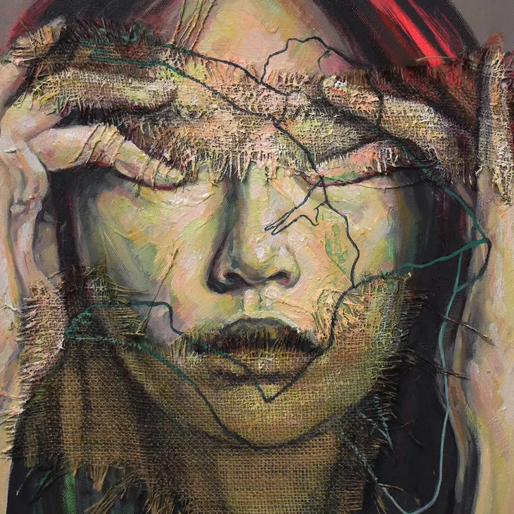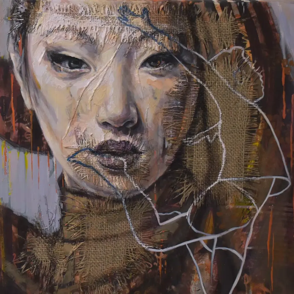 Oil and acrylic on canvas and jute. Three portraits of Asian girls, seeking empathy. Perhaps they are looking at the mirror, absorbed in their thoughts, worried about the post-pandemic era, hoping to escape, in a better future. They are introspective portraits, between being and appearing, so much so that small figures leap in front of them, as a psychological emanation, symbolizing the desire for novelty. Presented here as a triptych; the portraits are also offered separately (40x40 cm each).
