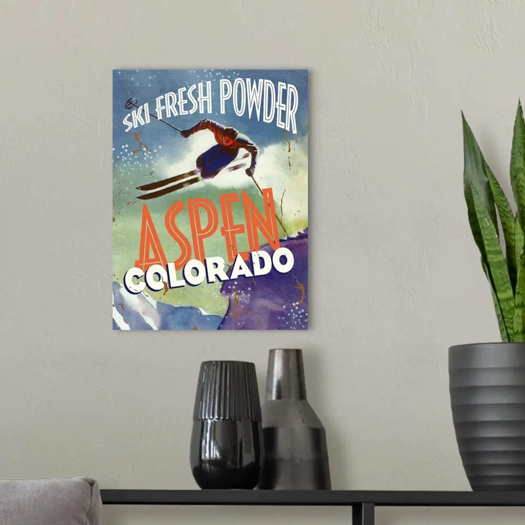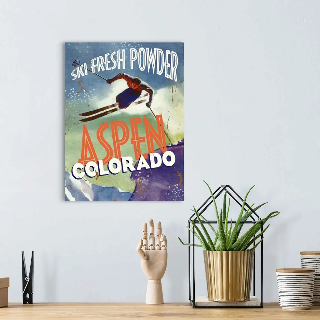 Aspen Colorado Ski Fresh Powder Vintage Advertising Poster wall art for home and office decor. Discover canvas art prints, photos, mural, big canvas art and framed wall art in GreatBigCanvas.com's varied collections.