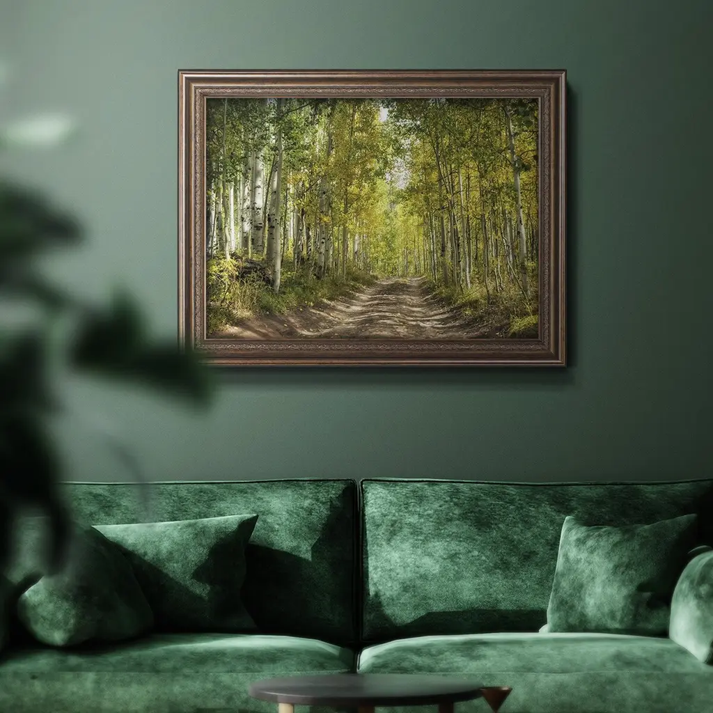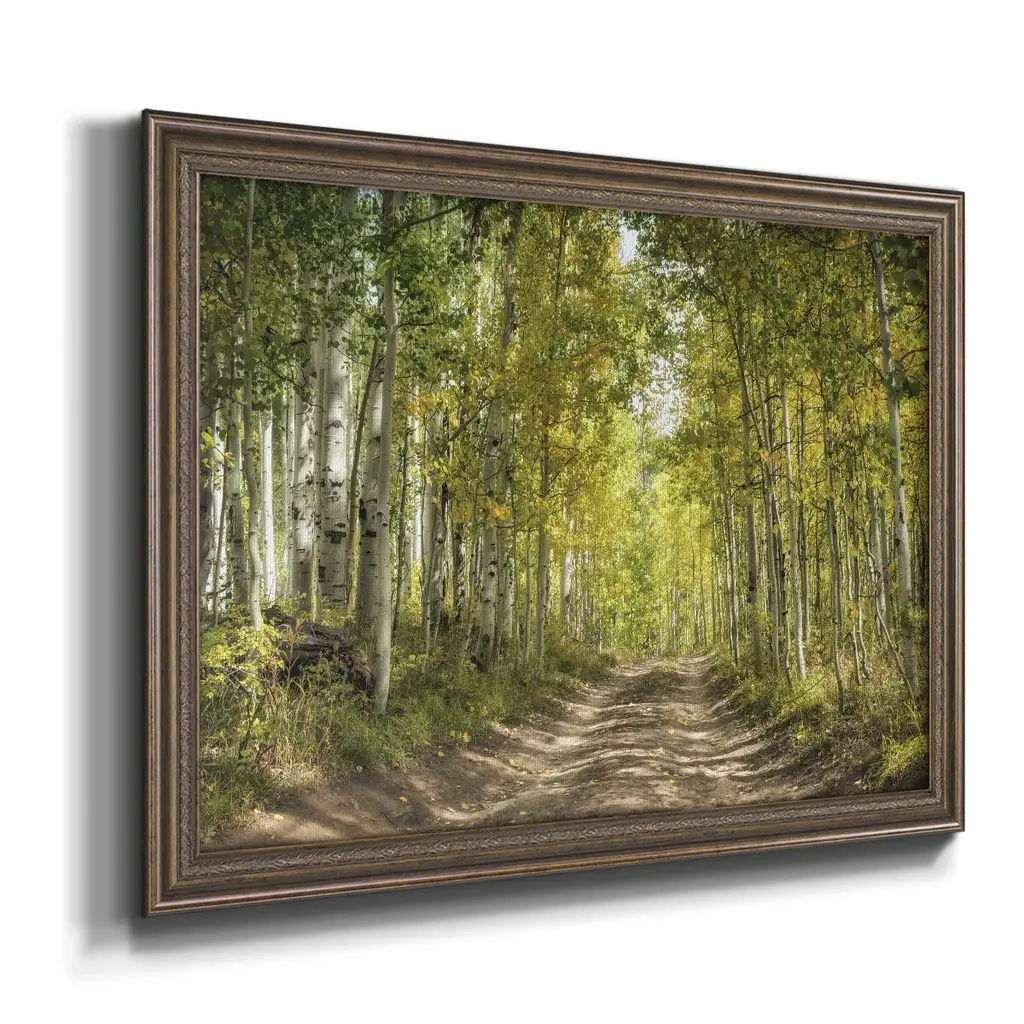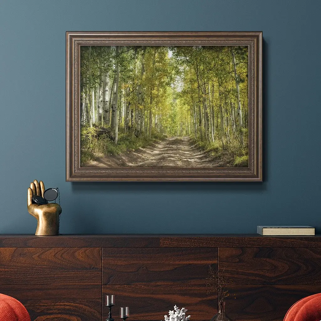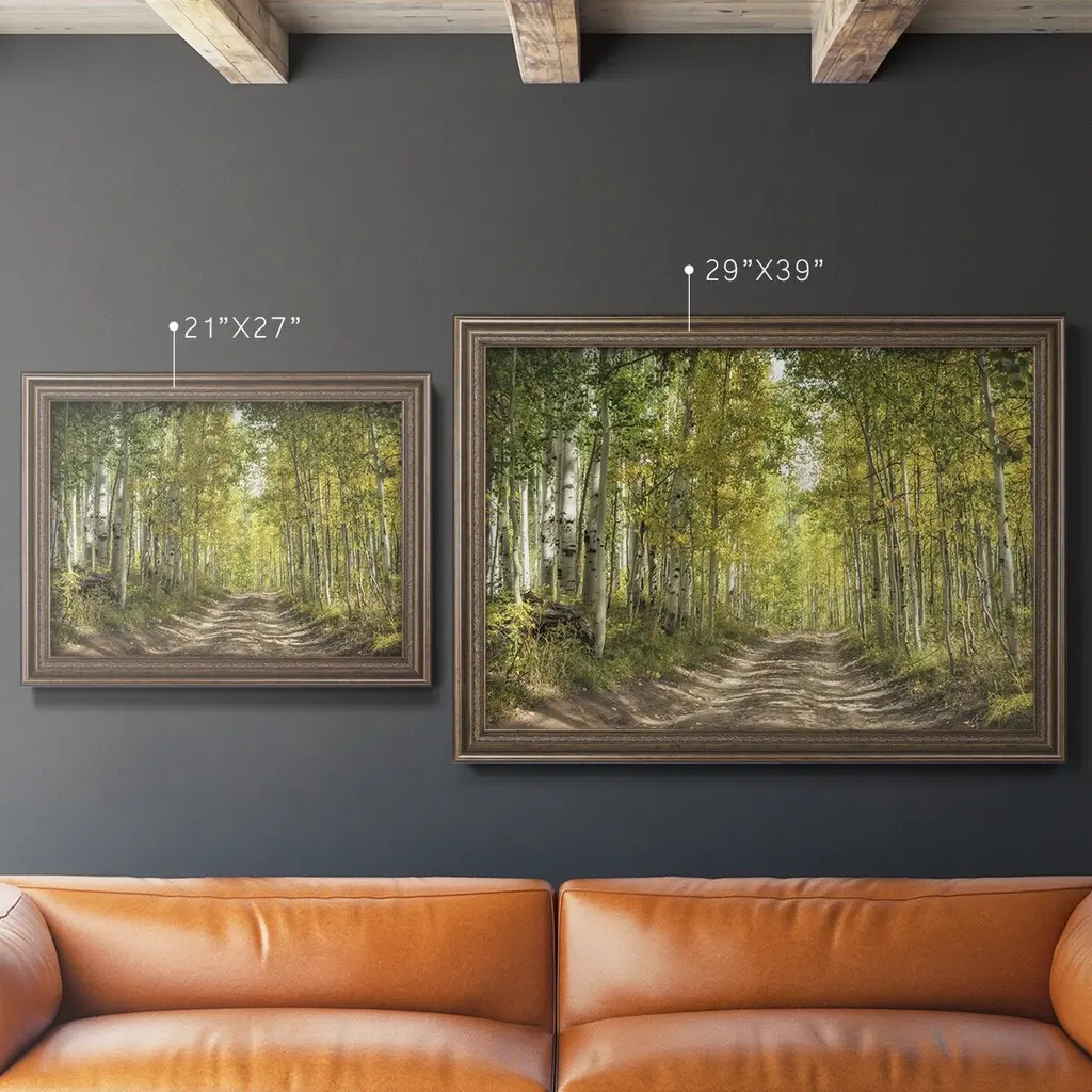 Aspen Drive Premium Framed Canvas- Ready to Hang A Premium Framed Canvas created to last. Framed in distressed wood and available in an array of sizes and colors Featuring a beveled a solid wood stretcher bar, each piece comes ready to hand 3 SIZES AVAILABLE 16''X20'' - Overall Size 18'X27'' - Overall Size 24''x36'' - Overall Size Each piece is made to order. Each piece comes with hanging hardware. Made in the USA Ready to Hang Giclee Paper Print Acrylic Glass Beveled Matt Board