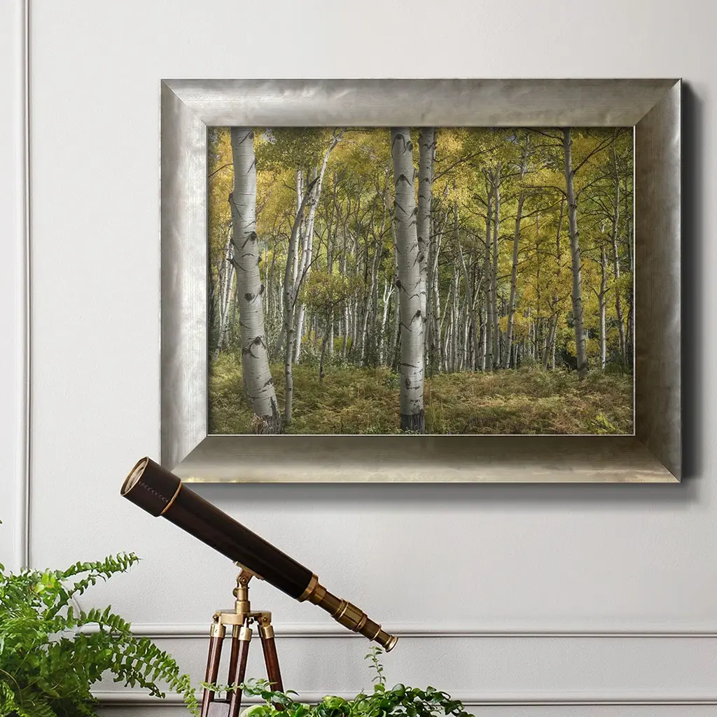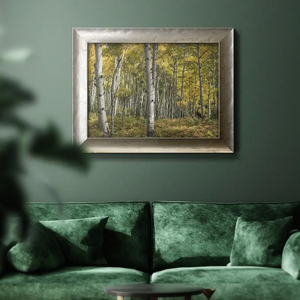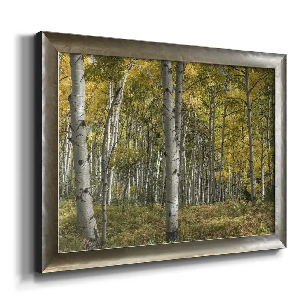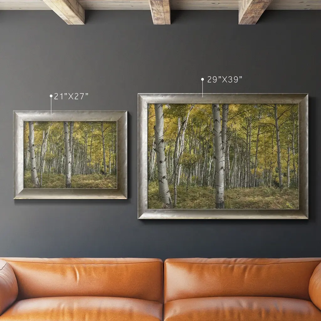 Aspen Grove II Premium Framed Canvas- Ready to Hang A Premium Framed Canvas created to last. Framed in distressed wood and available in an array of sizes and colors Featuring a beveled a solid wood stretcher bar, each piece comes ready to hand 3 SIZES AVAILABLE 16''X20'' - Overall Size 18'X27'' - Overall Size 24''x36'' - Overall Size Each piece is made to order. Each piece comes with hanging hardware. Made in the USA Ready to Hang Giclee Paper Print Acrylic Glass Beveled Matt Board
