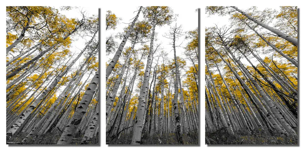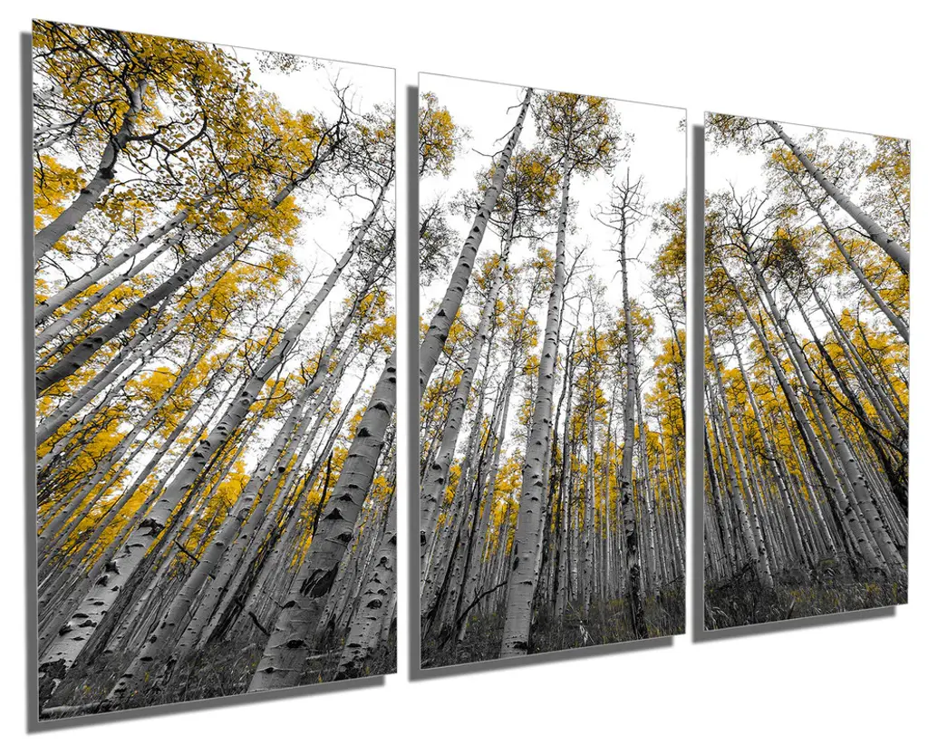 48" x 24" total size. Ready To Hang! (3 pieces - 16" x 24" each). 3 Panel Split (Triptych) Metal Print featuring Aspen Trees from below with yellow leaves. Modern metal wall art for home or office wall decor & interior design. Printed on Luxurious, HD aluminum glossy metal panels. Multi panel art.. HD aluminum panels. Metal print wall art. Includes Shadow Wall Mount on the back.• Aluminum Metal Wall Art• Made in USA• Ready to hang - No assembly required• Shadow mount hardware on the back• 0.045" thick HD Aluminum Panels• Scratch resistant, glossy finish• Superb color clarity, luxurious prints• Epson printing process• For indoor or moisture rich environment use• Easy to clean. Gently wipe with microfiber cloth.