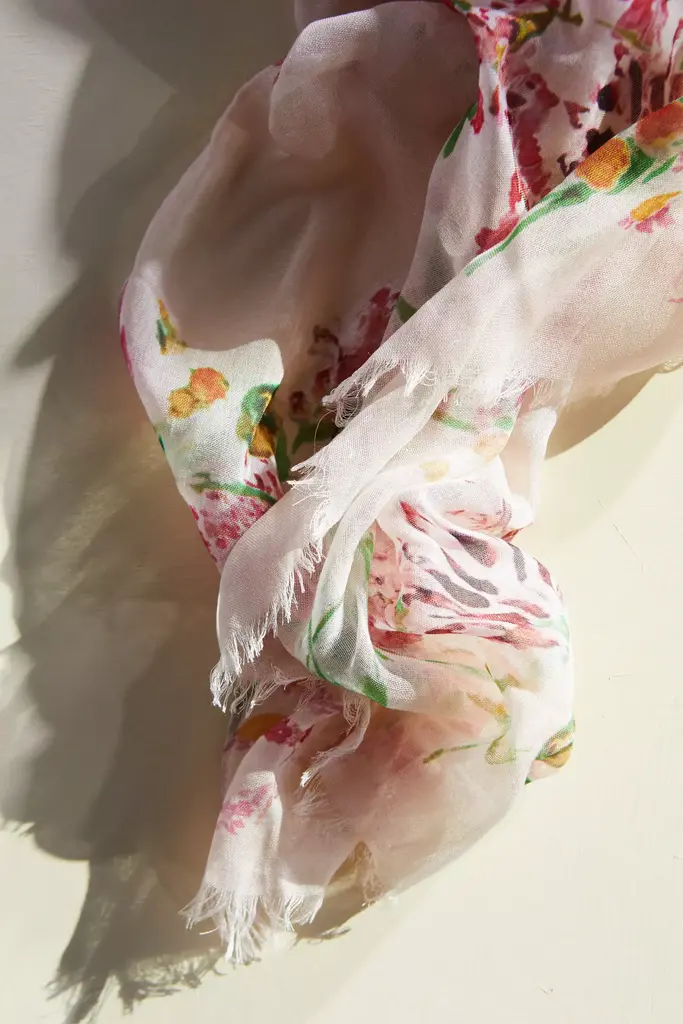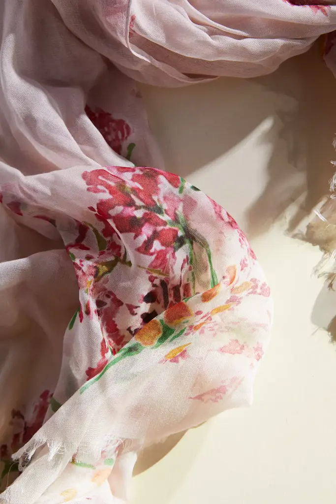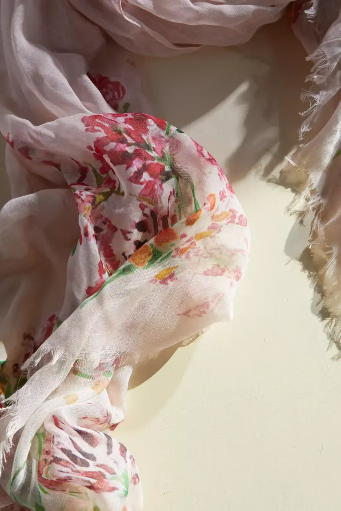 Topped with abstract blooms in soft shades inspired by nature, this luxurious scarf from Elizabeth Gillett combines delicate fabric with generous size. Each scarf design starts off as an original painting and is then translated into a digital print onto the softest material. Soft spun micromodal is a cellulose fiber made from processed wood pulp. It is prized for its exceptional drape and breathability. Elizabeth's low-impact dgital printing method consumes less water than other printing methods. About Elizabeth Gillett: Handmade and individually dyed, Elizabeth Gillett scarves combine delicate fabrics with a generous size and gorgeous botanical prints. Elizabeth uses a low water digital printing process, so it's easier on the environment. Elizabeth believes a scarf is the ultimate accessory that brightens up an outfit, makes traveling chic, and keeps us warm effortlessly and stylishly.