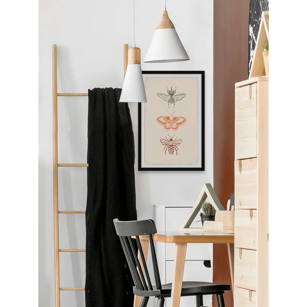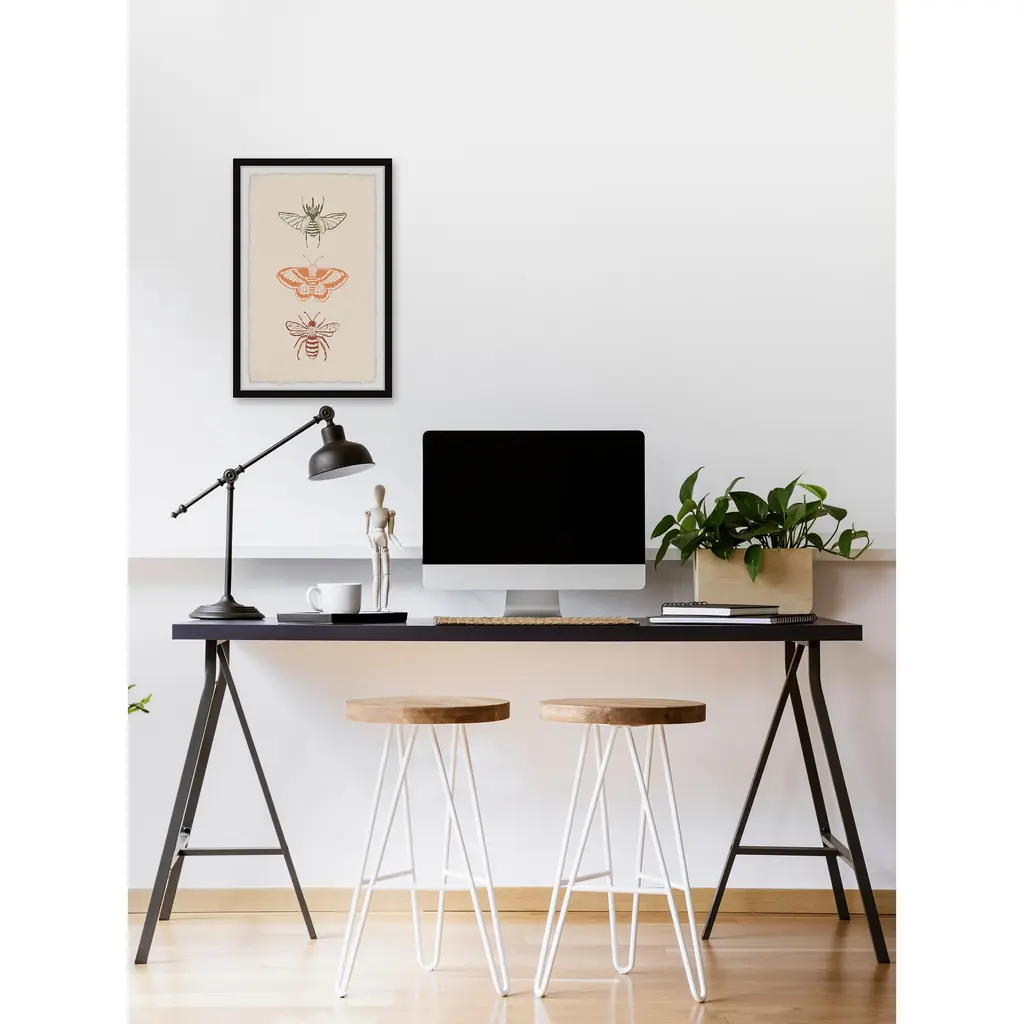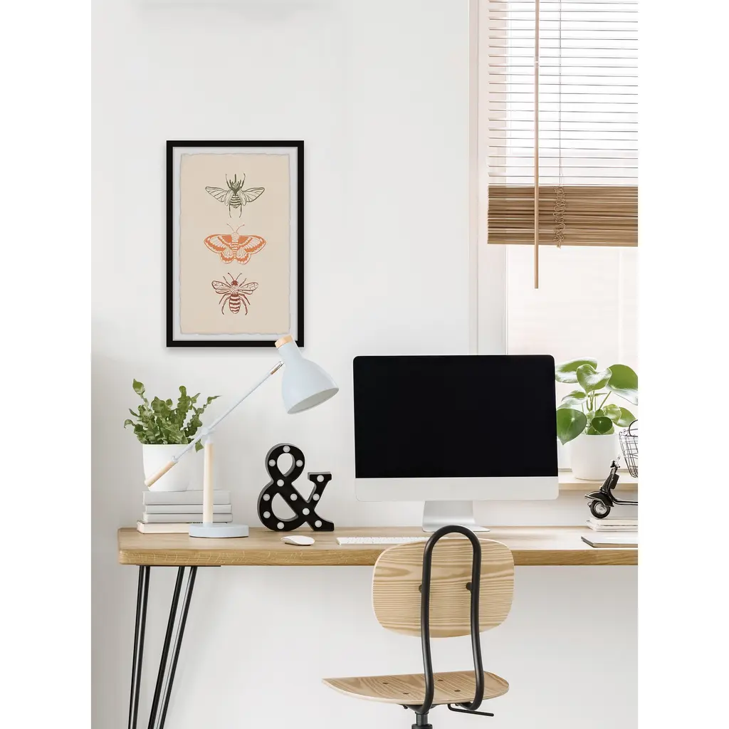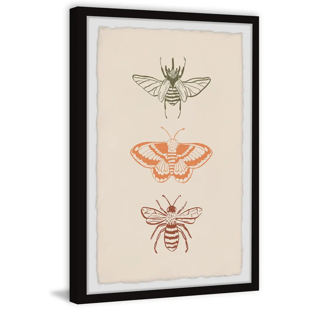Honor the beauty of nature's creations with this colorful drawing print that features three insects in a symmetrical column. Proudly printed in the USA, this piece is printed on high quality archive paper and professionally hand-framed. With wall-mounting hooks included, this artful accent is ready to hang up as soon as it reaches your front door. • Top quality Giclee print on high resolution Archive Paper • Hand cut deckled edges • High quality durable non-warping frame • Finished under shatter resistant plexiglass • Arrives ready to hang • Includes a certificate of authenticity • Printed in the USA