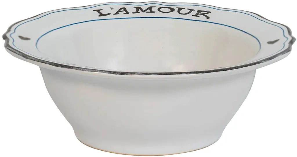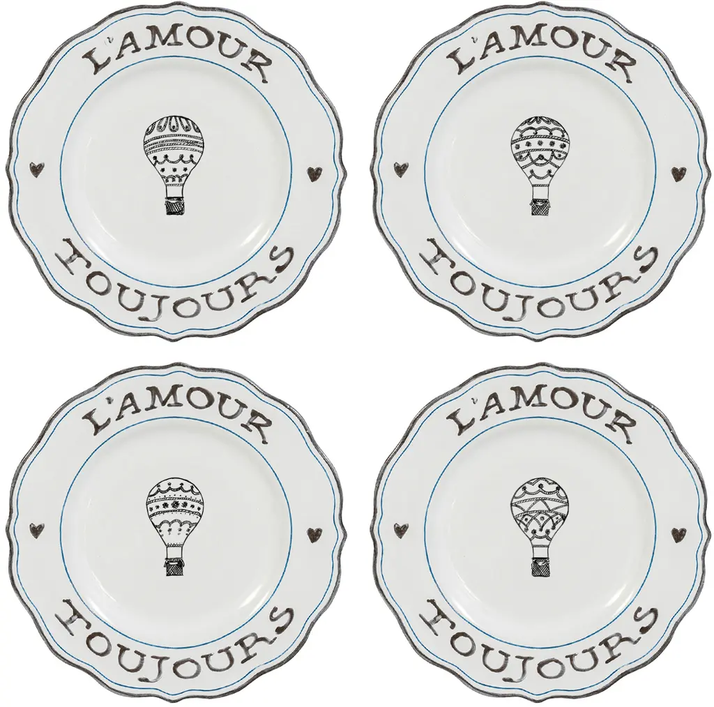 L'amour Toujours, French for "Love Always," is the sentiment inscribed on this 16-piece stoneware set consisting of four dinner plates, four dessert/salad plates, four cereal bowls, and four cups. Also adorned with hand-sketched hot-air balloons and slender pinstripes, this table setting for four is one you'll, well, love always. Made in Portugal, it's as practical as it is lovely: It can go from freezer to oven or microwave to dishwasher with ease.