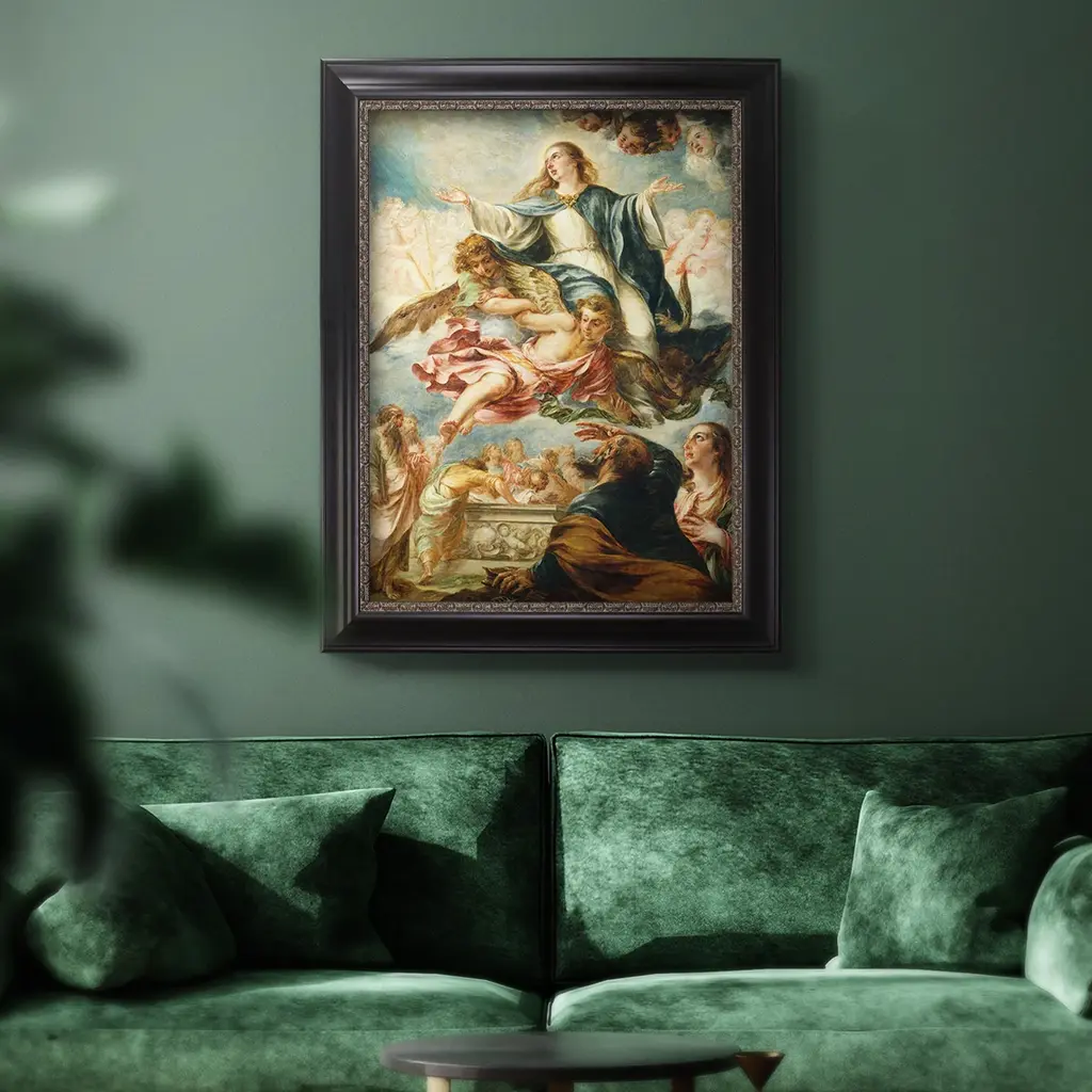 Assumption of the Virgin Premium Framed Canvas- Ready to Hang A Premium Framed Canvas created to last. Framed in distressed wood and available in an array of sizes and colors Featuring a beveled a solid wood stretcher bar, each piece comes ready to hand 3 SIZES AVAILABLE 16''X20'' - Overall Size 18'X27'' - Overall Size 24''x36'' - Overall Size Each piece is made to order. Each piece comes with hanging hardware. Made in the USA Ready to Hang Giclee Paper Print Acrylic Glass Beveled Matt Board