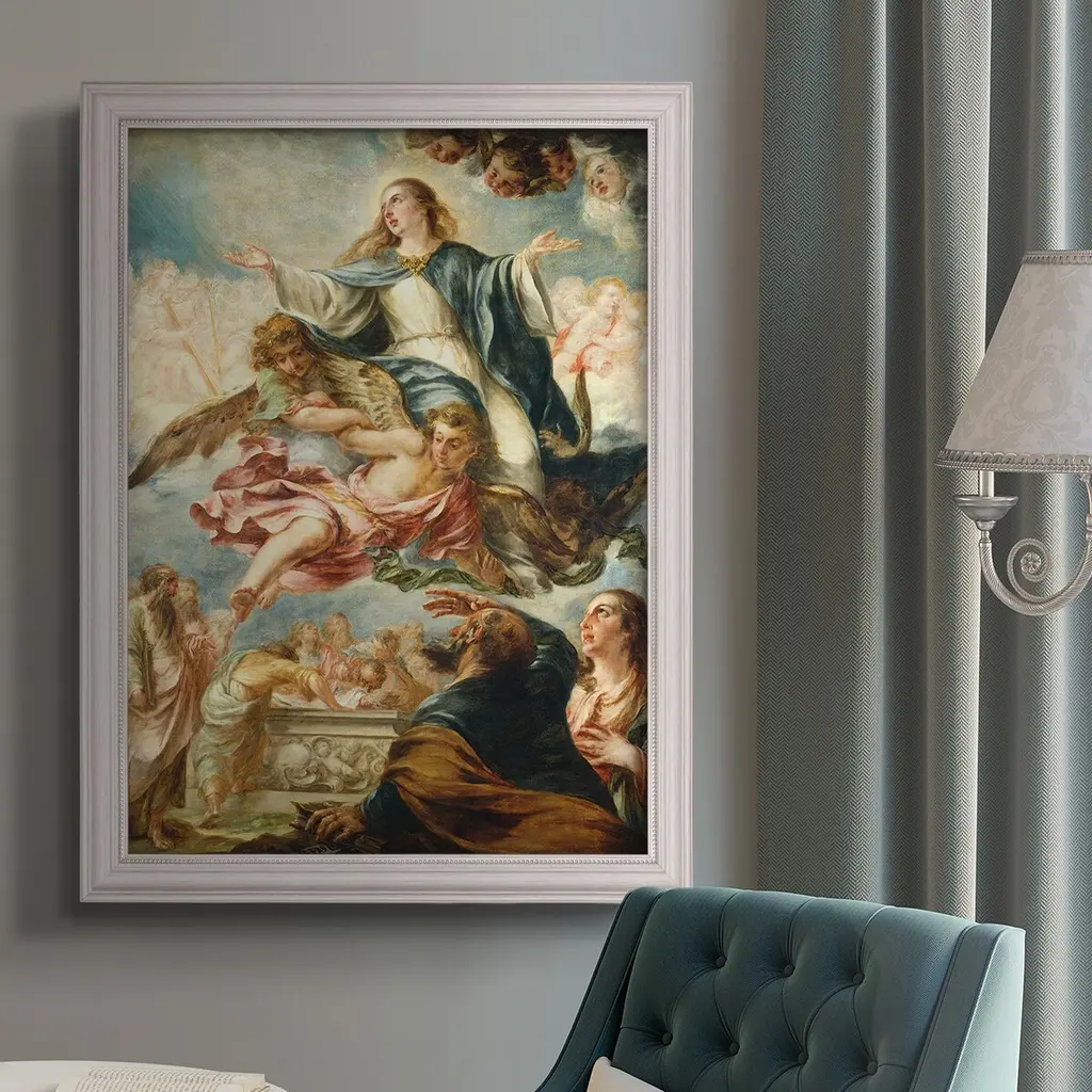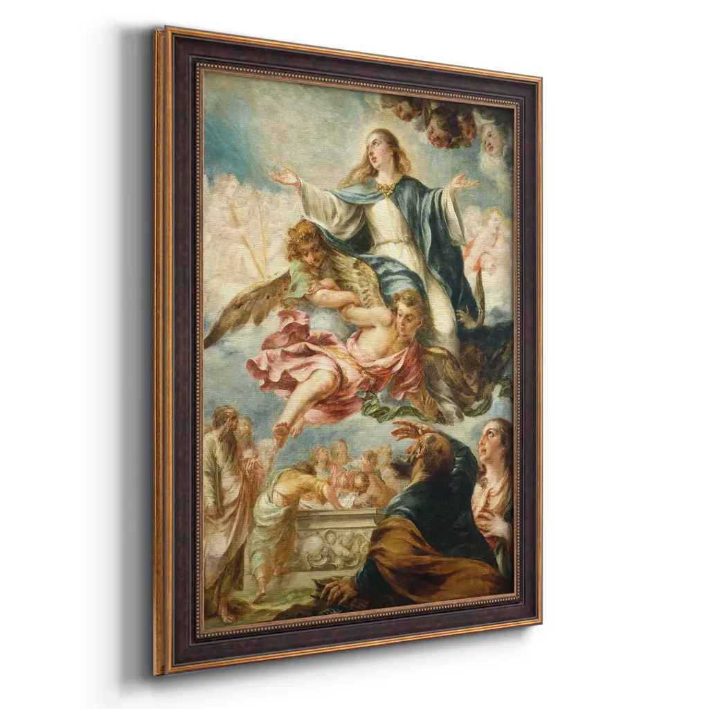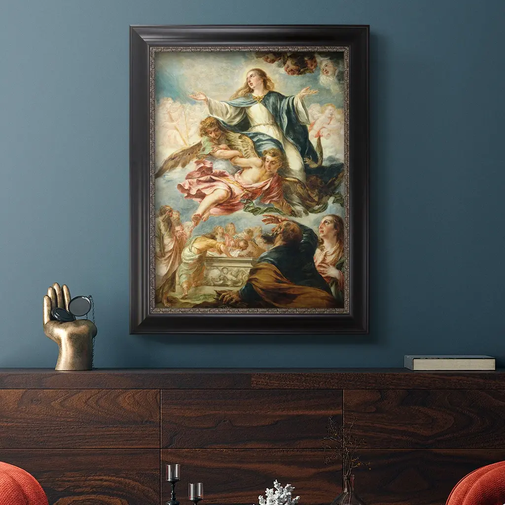 Assumption of the Virgin Premium Framed Canvas- Ready to Hang A Premium Framed Canvas created to last. Framed in distressed wood and available in an array of sizes and colors Featuring a beveled a solid wood stretcher bar, each piece comes ready to hand 3 SIZES AVAILABLE 16''X20'' - Overall Size 18'X27'' - Overall Size 24''x36'' - Overall Size Each piece is made to order. Each piece comes with hanging hardware. Made in the USA Ready to Hang Giclee Paper Print Acrylic Glass Beveled Matt Board