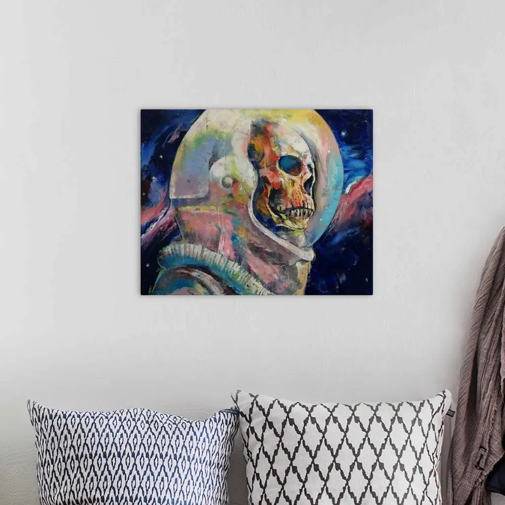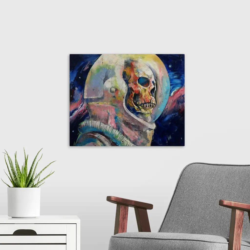 A contemporary painting of a human skull seen through the helmet glass of an astronaut suit.