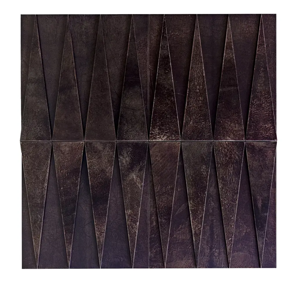 Wall panels made of two layers of wood, covered with goatskin cuts, colored in tobacco color with natural shadows creating a nice geometric pattern. A detailed hand work, showing the beauty of the material and high quality of craftsmanship. The finishing is matt, but can also be high gloss, or combined. Price per sqm refers to a plain paneled surface. Each panel is 40x40cm and it can be customized, a set of 4 panels is present in the picture. Please, ask the Concierge for more information.