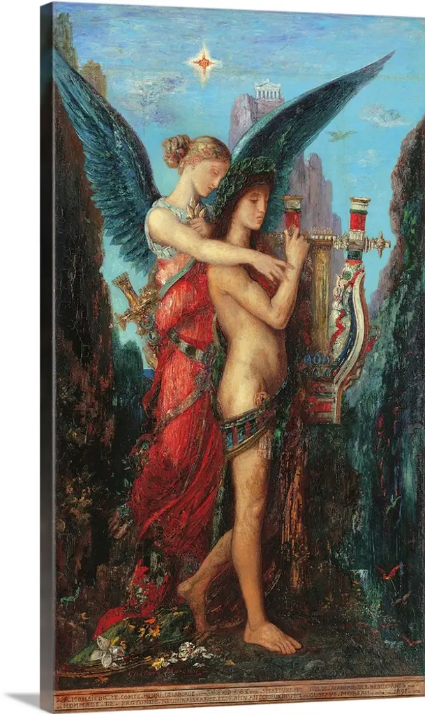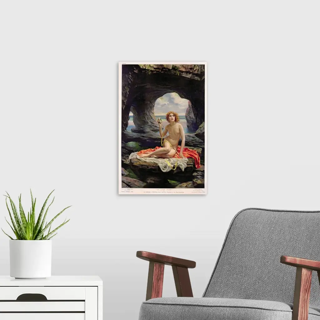 A nude woman sits on a large flat rock inside a cave with fabric draped underneath her while holding an object in one of her hands.