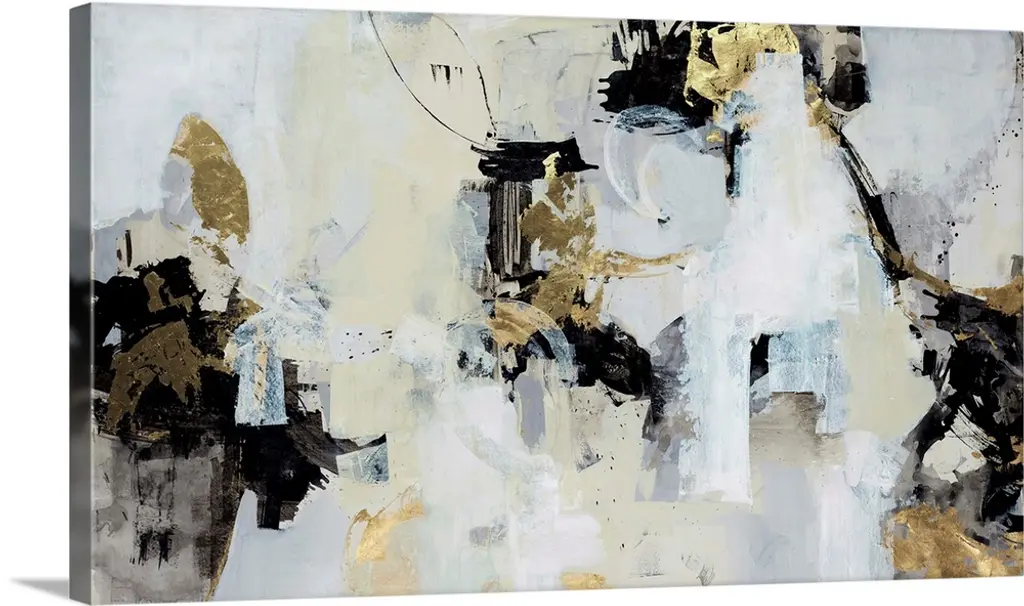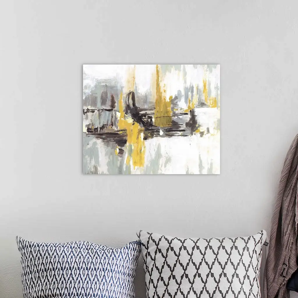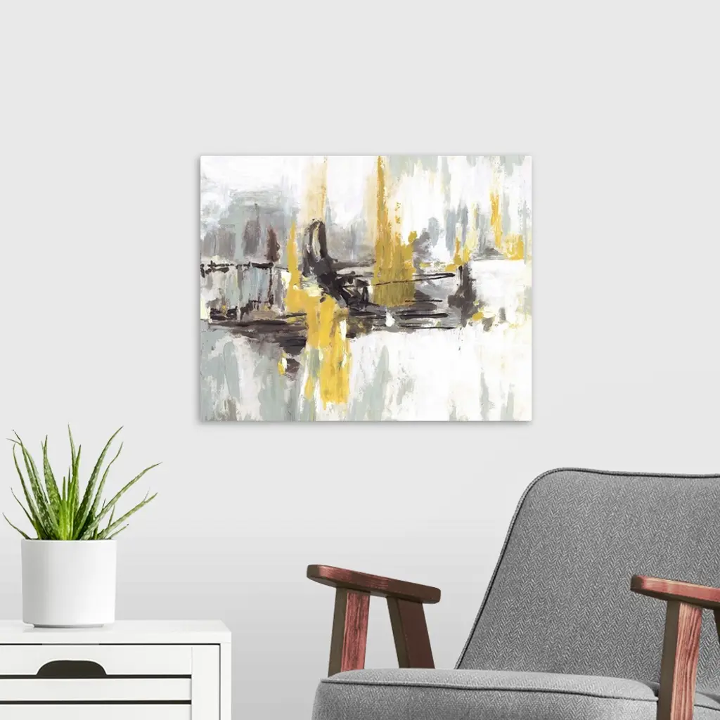 Contemporary abstract artwork in black and white embellished with bright yellow areas.