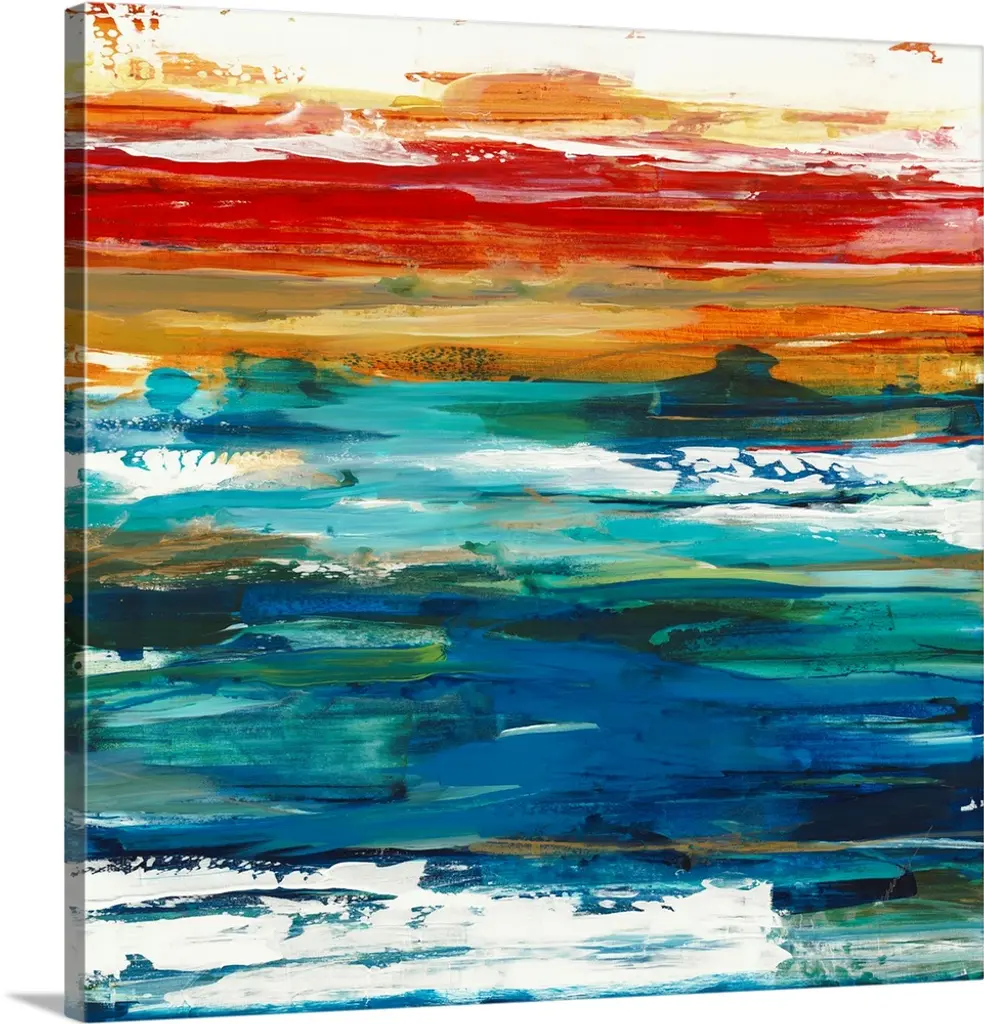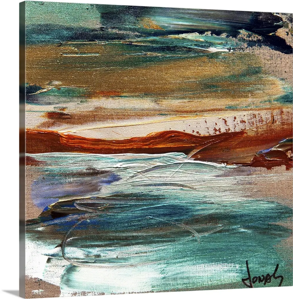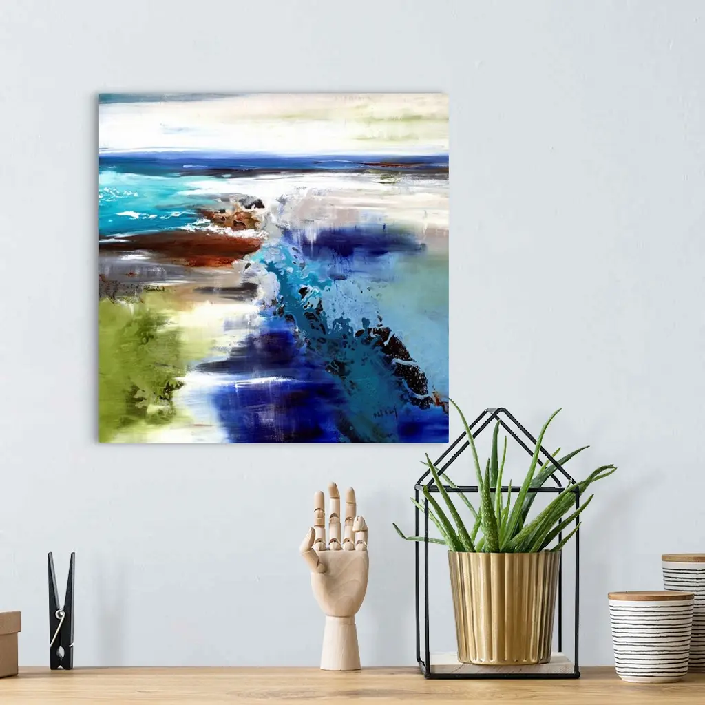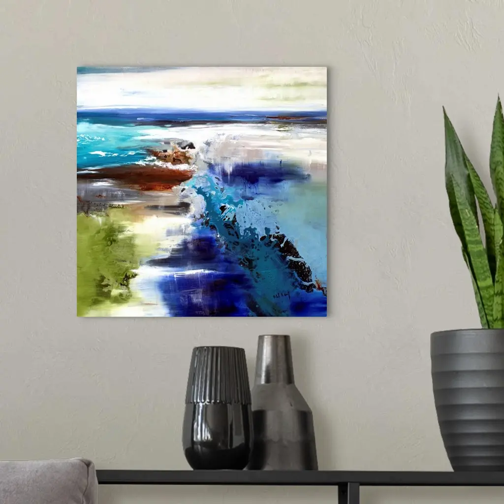Square painting of an abstract lake landscape in shades of blue, green, brown, gray, and white.