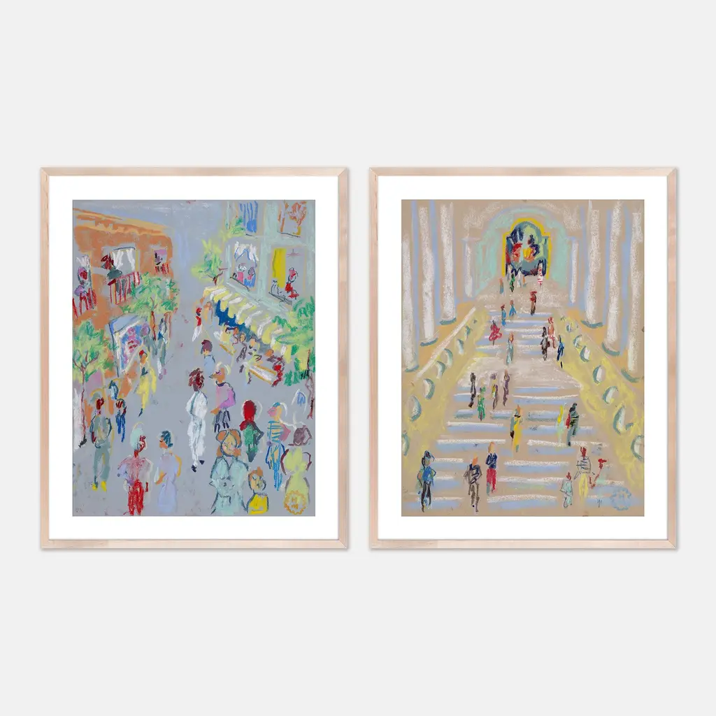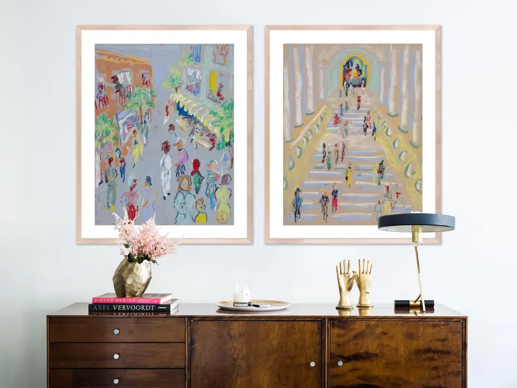 DESCRIPTION: At the Museum & In the Street Diptych by Happy Menocal in Natural Maple Frame, XS Art Print SPECIFICATIONS: Type: Framed Paper. Individual Frame Size (in): 13x16. Orientation: Vertical. Flush/Float/Matted: Matted. Frame Color: Natural Maple. Hanging Hardware: Picture Perfect. 2 pieces are included with this purchase. Overall set dimensions as pictured: 26x16. FRAMING: Each art work arrives framed and ready to hang. We use handmade frames with a plexiglass glazing front, because it offers less glare than standard glass. At this time, we only offer framed prints. ARTIST BIO: Happy Menocal is a New York-based artist and creative director. She is known for her spirited illustration style and profligate use of color. Founded in 2012, her studio specializes in personal and corporate event stationery, brand identity, murals and textile design for private clients and hospitality groups.