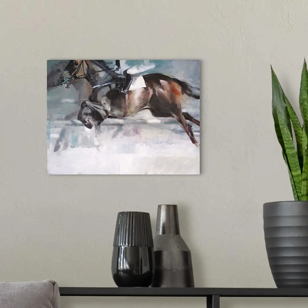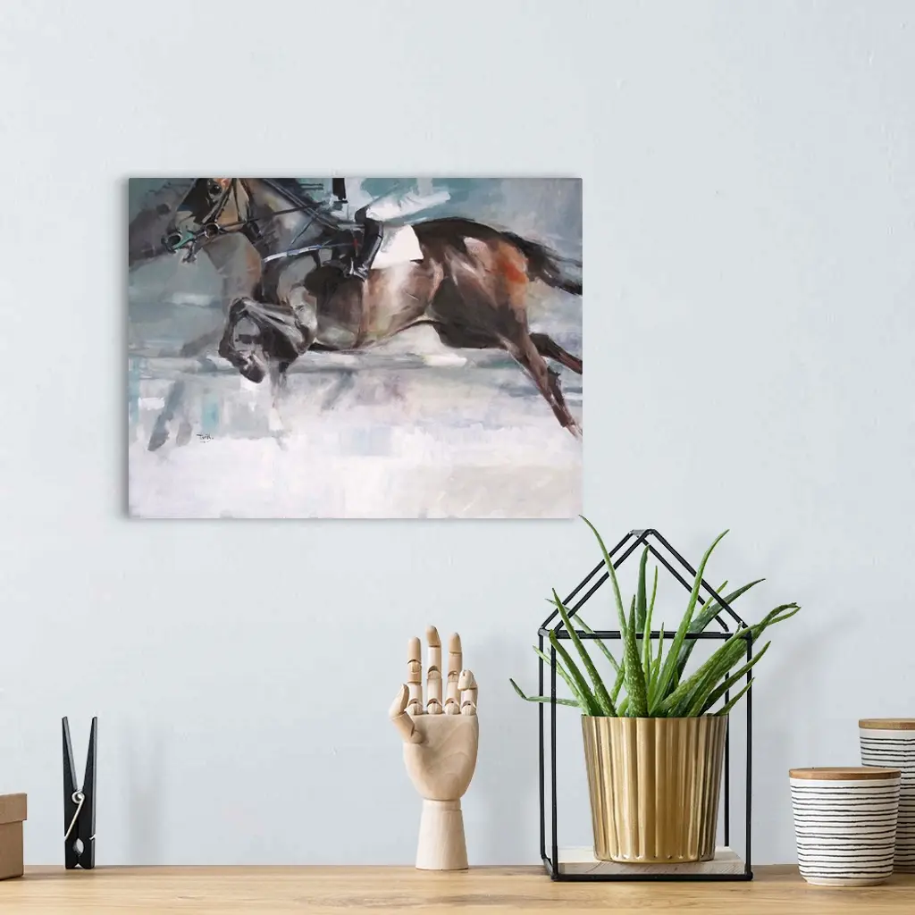 This contemporary artwork utilizes striking form and cast shadows that captures the strength of a horse mid-gallop during a race.