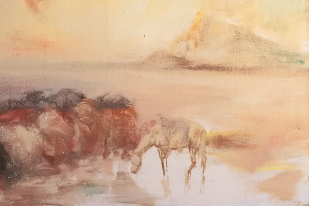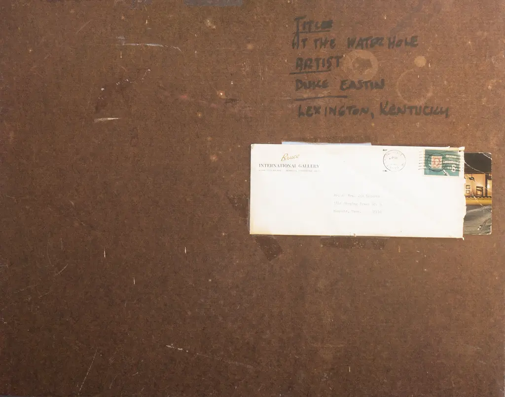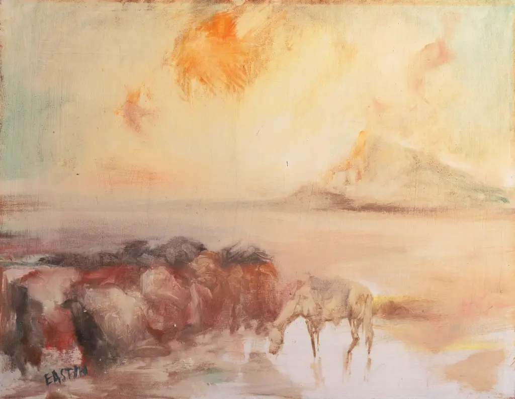 Signed lower left, 'Eastin' for Delbert �����Duke������ Eastin (American, 1929-2017) and painted circa 1973. Additionally titled, verso, 'At the Water Hole', signed, and accompanied by old paperwork. Previously with: Bruce International Gallery, Memphis, TN. Provenance: Mr. & Mrs. Jim Roberts, Memphis, TN. Kentucky artist Duke Eastin traveled across America for his art and exhibited with success in Lexington before, later, settling permanently in Mississippi.