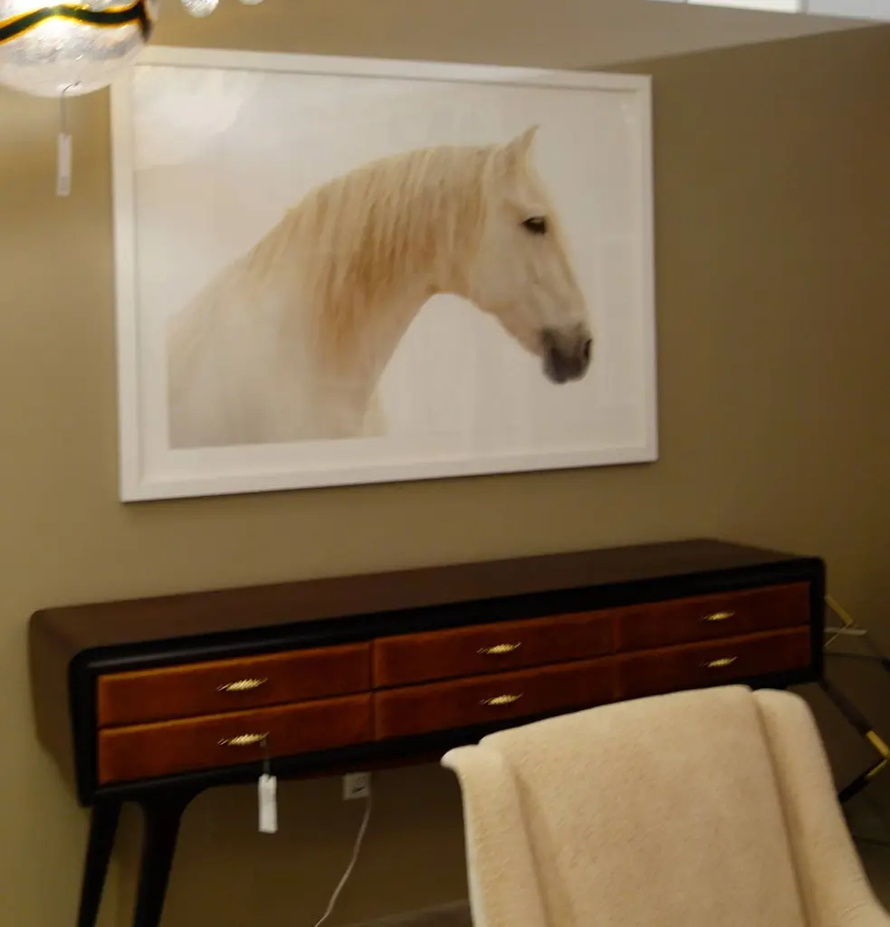 Lisa Houlgrave's portrait features the mighty Andalusian stallion, Novelisto D, who played Colin Farrell's guardian angel, Athansor, In Warner Brother's Movie, "Winter's Tale." Renowned Hollywood horse trainer, Rex Peterson, scoured the country for nearly a year searching for this special horse to play the powerful and magical hero. Athansor is printed by the Masters at Duggal, New York, on archival giclee Fine art paper with a deckled edge mounted on a polar white museum board under plexiglass with a 1.5" white frame. The print size is 54" x 37" and is mounted to a 56" x 39" matte board. The overall framed size is 60" x 43".The print comes with an aluminum wall bracket and support for hanging. Virginia born fashion and portrait photographer, Lisa Houlgrave has been involved in the glitz and glamour of fashion for over 25 years, yet remains a country girl at heart. Her elegant and dynamic images have appeared in many magazines and have graced the walls of the Rock and Roll Hall of Fame in addition to many private collections and galleries. Another one of her beautiful images of Novelisto D was used by the prestigious Musuem of Natural History, Utah, to promote their exhibition of "The Horse." Please contact dealer for additional size options and prices. Edition Number 4/125, signed and numbered on back.