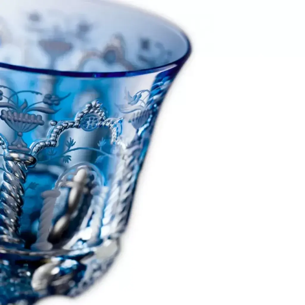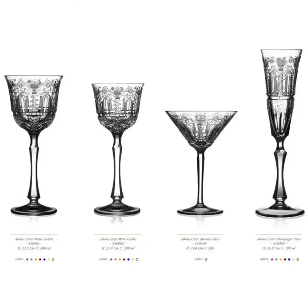 The Athens collection is a beautifully hand-crafted crystal line that uses classic and fast disappearing cutting and engraving techniques. The precise work of the columns and leaves running throughout the crystal bespeaks the highest quality of craftsmanship. Art aficionados applaud the superb craftsmanship and distinguished artistry found inherent in every piece of Varga Art Crystal. From the Varga design studios and forty person glassworks in Budapest, Hungary, famous husband and wife team Ildikó and Sándor Varga – a third generation glass master – create crystal artwork that graces palaces, embassies, museums and celebrity homes around the globe. Each piece of Varga is an original – skillfully and creatively crafted entirely by hand. Each hand-cut stem or intricately engraved crystal masterpiece is individually signed by hand and may require months to craft. Imagine an artist moving his canvas against a fixed brush to create his masterpiece: this is the essence of the rare art of copper and diamond-wheel engraving that is practiced today only by a handful of highly skilled craftsmen.