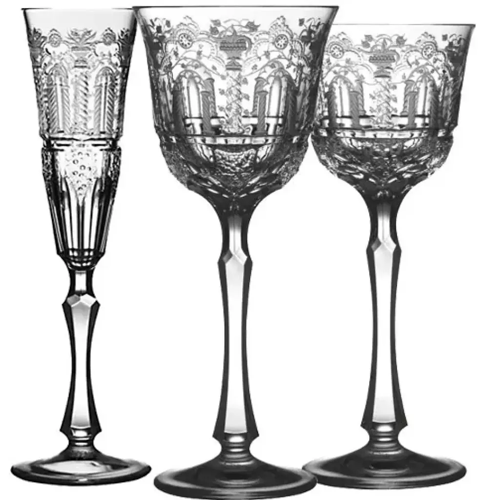 The Athens collection is a beautifully hand-crafted crystal line that uses classic and fast disappearing cutting and engraving techniques. The precise work of the columns and leaves running throughout the crystal bespeaks the highest quality of craftsmanship. Art aficionados applaud the superb craftsmanship and distinguished artistry found inherent in every piece of Varga Art Crystal. From the Varga design studios and forty person glassworks in Budapest, Hungary, famous husband and wife team Ildikó and Sándor Varga – a third generation glass master – create crystal artwork that graces palaces, embassies, museums and celebrity homes around the globe. Each piece of Varga is an original – skillfully and creatively crafted entirely by hand. Each hand-cut stem or intricately engraved crystal masterpiece is individually signed by hand and may require months to craft. Imagine an artist moving his canvas against a fixed brush to create his masterpiece: this is the essence of the rare art of copper and diamond-wheel engraving that is practiced today only by a handful of highly skilled craftsmen.