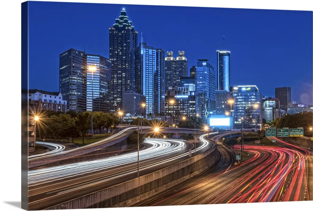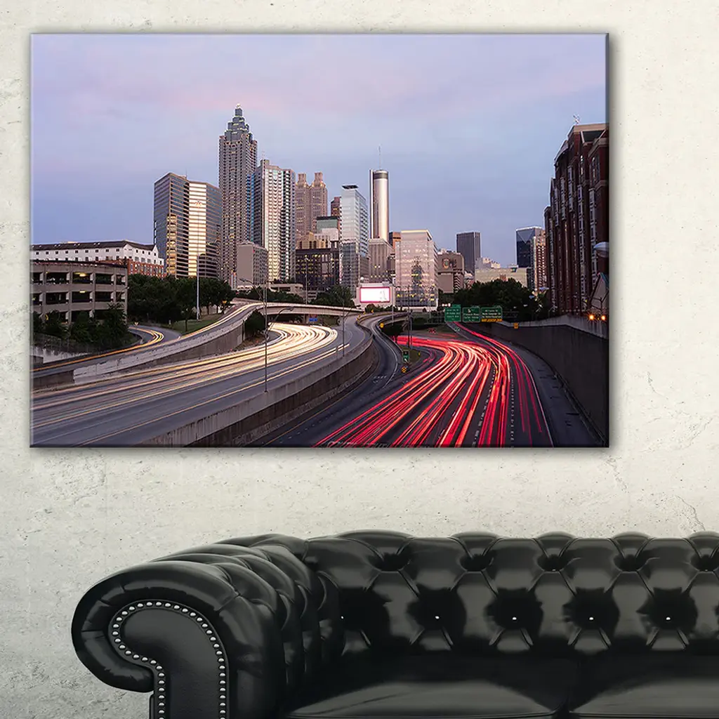 The Atlanta Georgia Rush Hour Traffic at Dusk canvas art print is sure to make an impression on anyone who sees it. This artwork is gallery wrapped around a 1-inch solid wood frame and arrives carefully packaged and entirely ready to hang on the wall. Design Art only uses the highest resolution and pigments to ensure a crisp colorful print that is never faded or pixelated. This artwork is sure to be a conversation starter in any home or office.