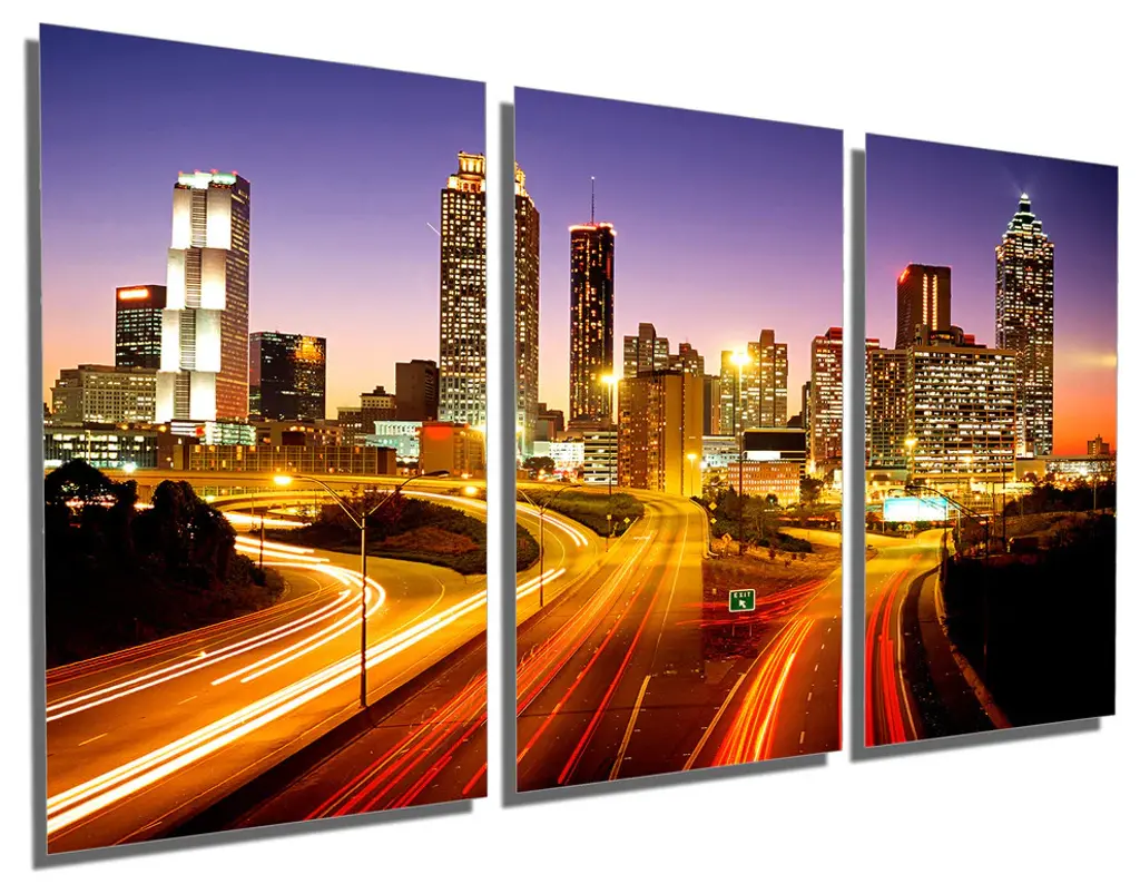 48"œ x 24"œ total size. Ready To Hang! (3 pieces - 16"œ x 24"œ each). 3 Panel Split (Triptych) Metal Print of Atlanta, Georgia Skyline at dusk. Modern metal wall art for home or office wall decor & interior design. Printed on Luxurious, HD aluminum glossy metal panels. Multi panel art.. HD aluminum panels. Metal print wall art. Includes Shadow Wall Mount on the back.• Aluminum Metal Wall Art• Made in USA• Ready to hang - No assembly required• Shadow mount hardware on the back• 0.045"œ thick HD Aluminum Panels• Scratch resistant, glossy finish• Superb color clarity, luxurious prints• Epson printing process• For indoor or moisture rich environment use• Easy to clean. Gently wipe with microfiber cloth.