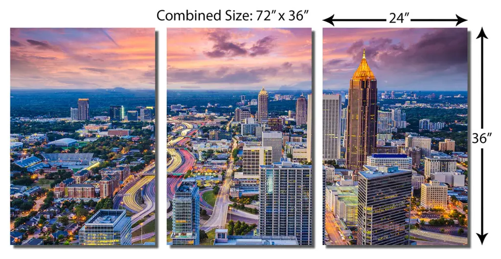 72"œ x 36"œ total size. Ready To Hang! (3 pieces - 24"œ x 36"œ each). 3 Panel Split (Triptych) Atlanta, Georgia Evening Skyline Metal Print, view under purplish skies. Modern metal wall art for home or office wall decor & interior design. Printed on Luxurious, HD aluminum glossy metal panels. Multi panel art.. HD aluminum panels. Metal print wall art. Includes Shadow Wall Mount on the back.• Aluminum Metal Wall Art• Made in USA• Ready to hang - No assembly required• Shadow mount hardware on the back• 0.045"œ thick HD Aluminum Panels• Scratch resistant, glossy finish• Superb color clarity, luxurious prints• Epson printing process• For indoor or moisture rich environment use• Easy to clean. Gently wipe with microfiber cloth.