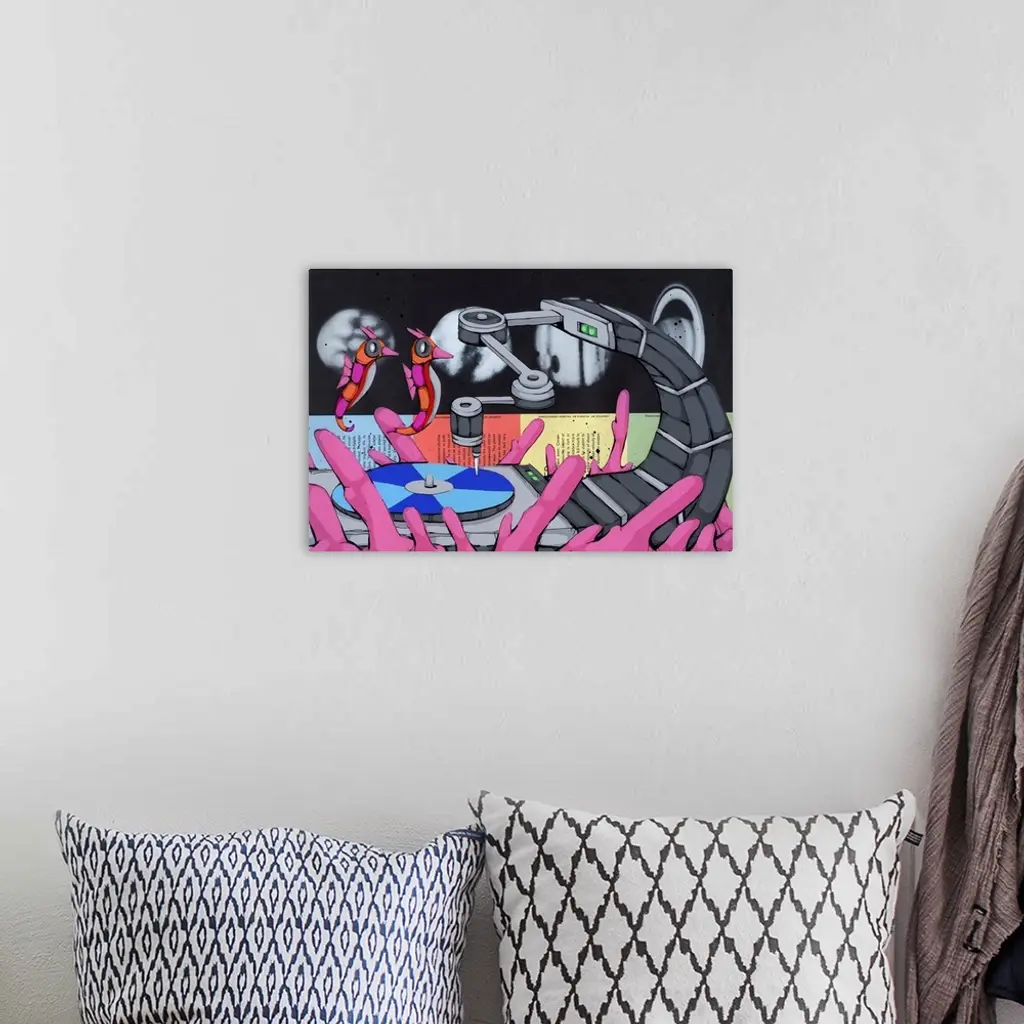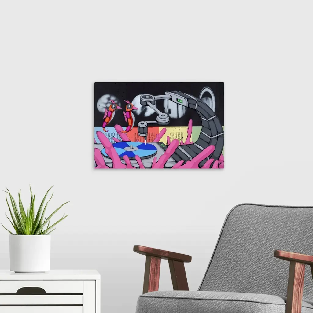 Pop art painting of two seahorses floating towards a needle on a record player.